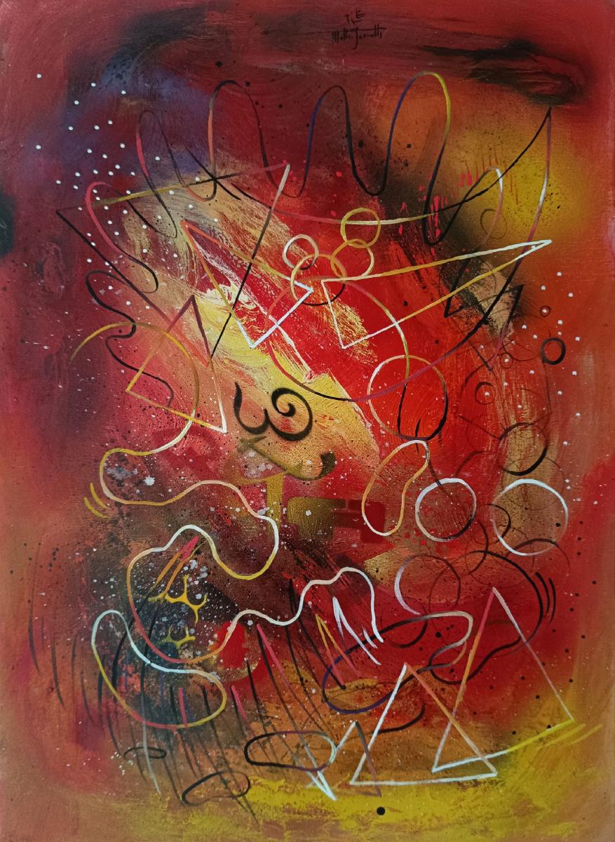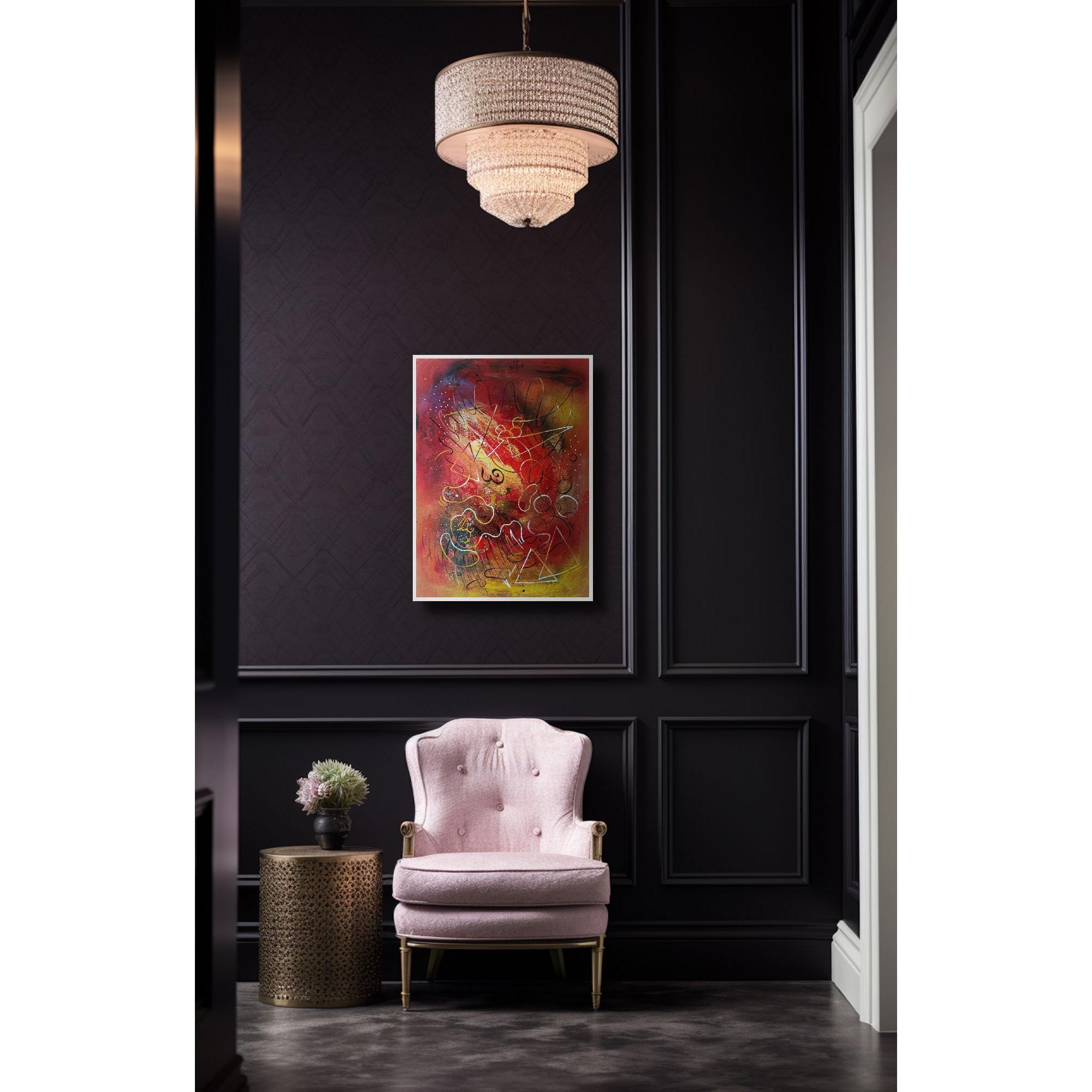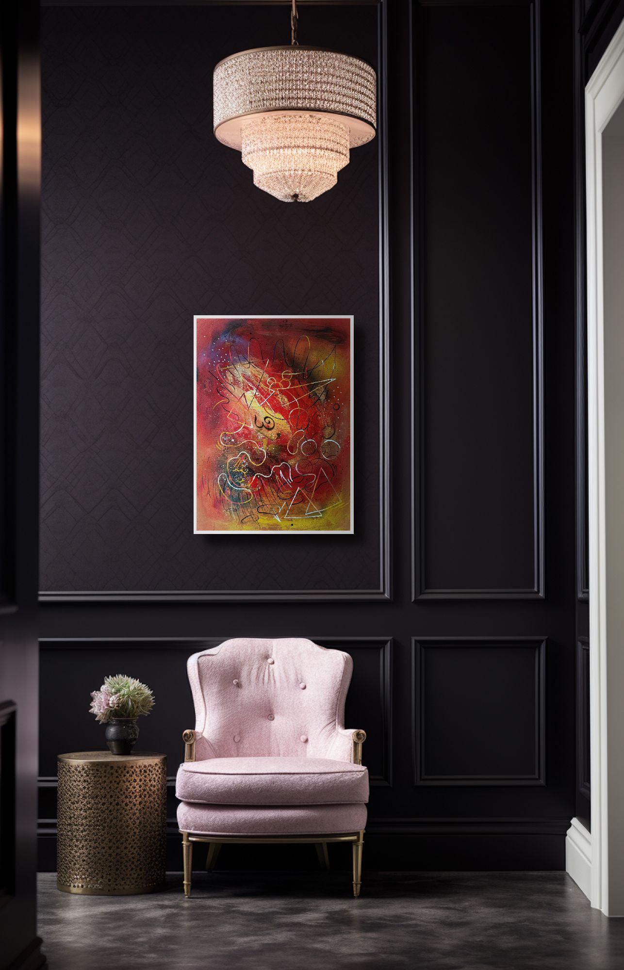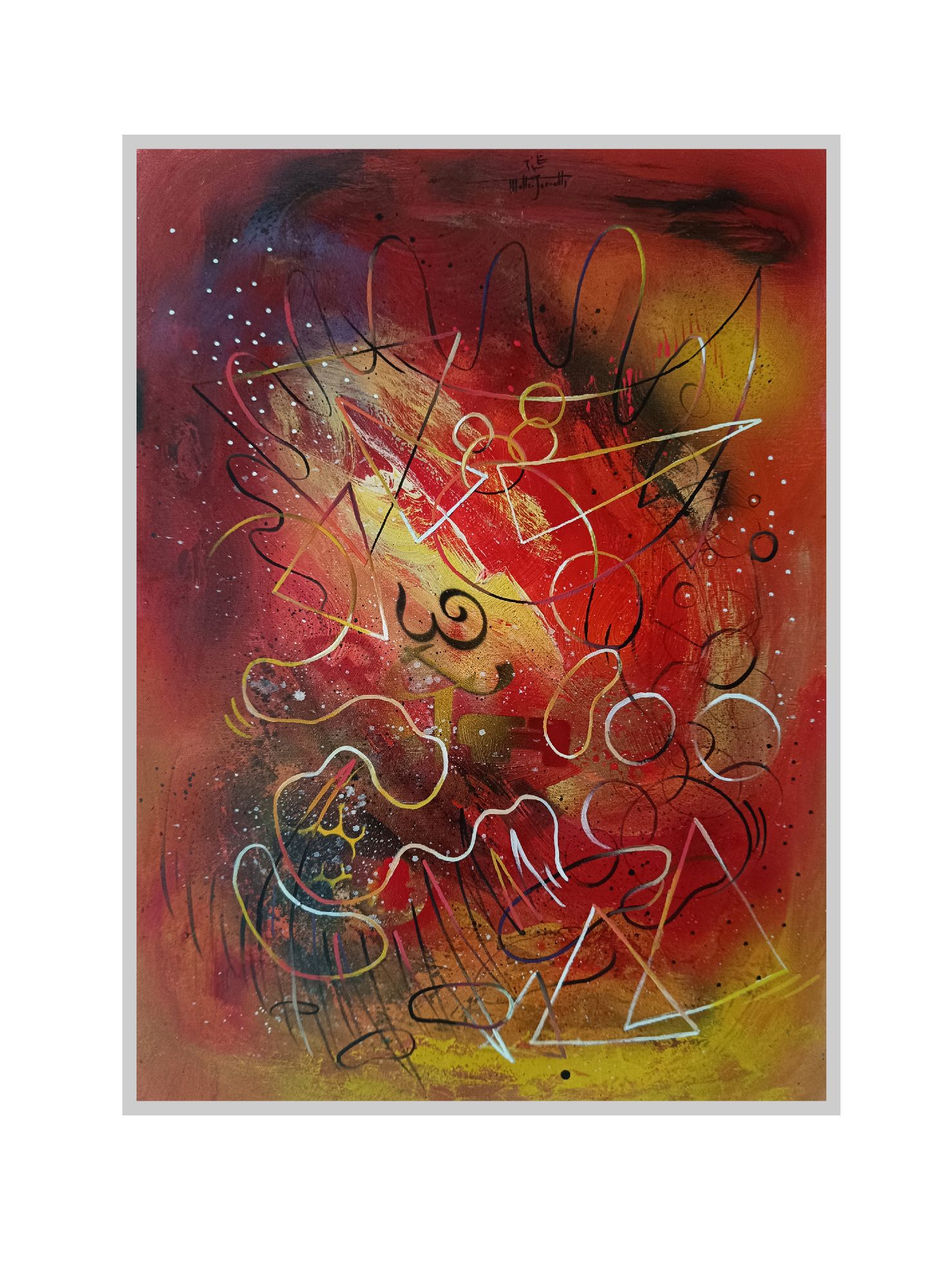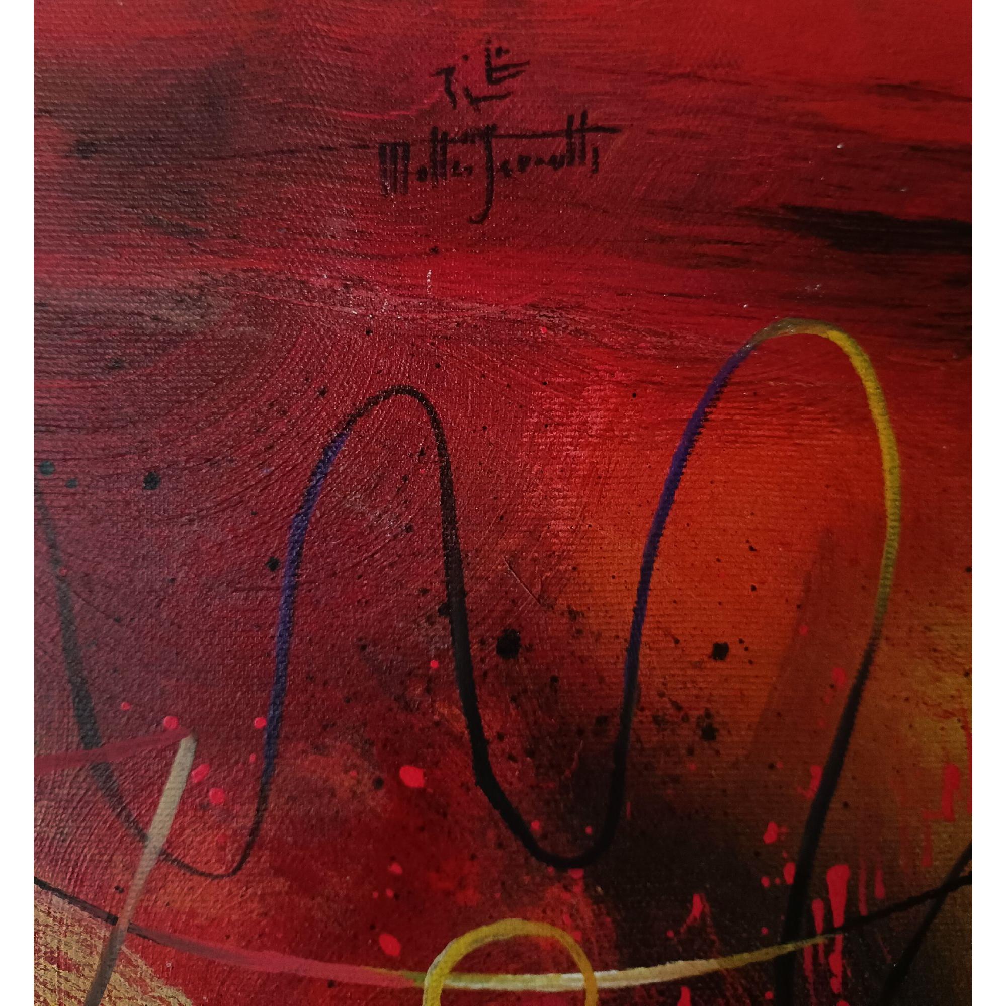 Un’opera che vibra di intensità e movimento, in cui il rosso e il giallo si fondono come fiamme in continua trasformazione. Le linee fluide e i segni geometrici evocano ritmo e vibrazione, come se la tela fosse attraversata da una musica visiva fatta di energia pura. Sinfonia di fuoco è un inno alla forza vitale e alla potenza creatrice del colore.