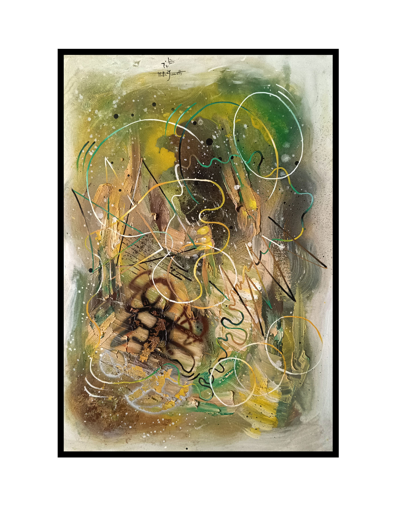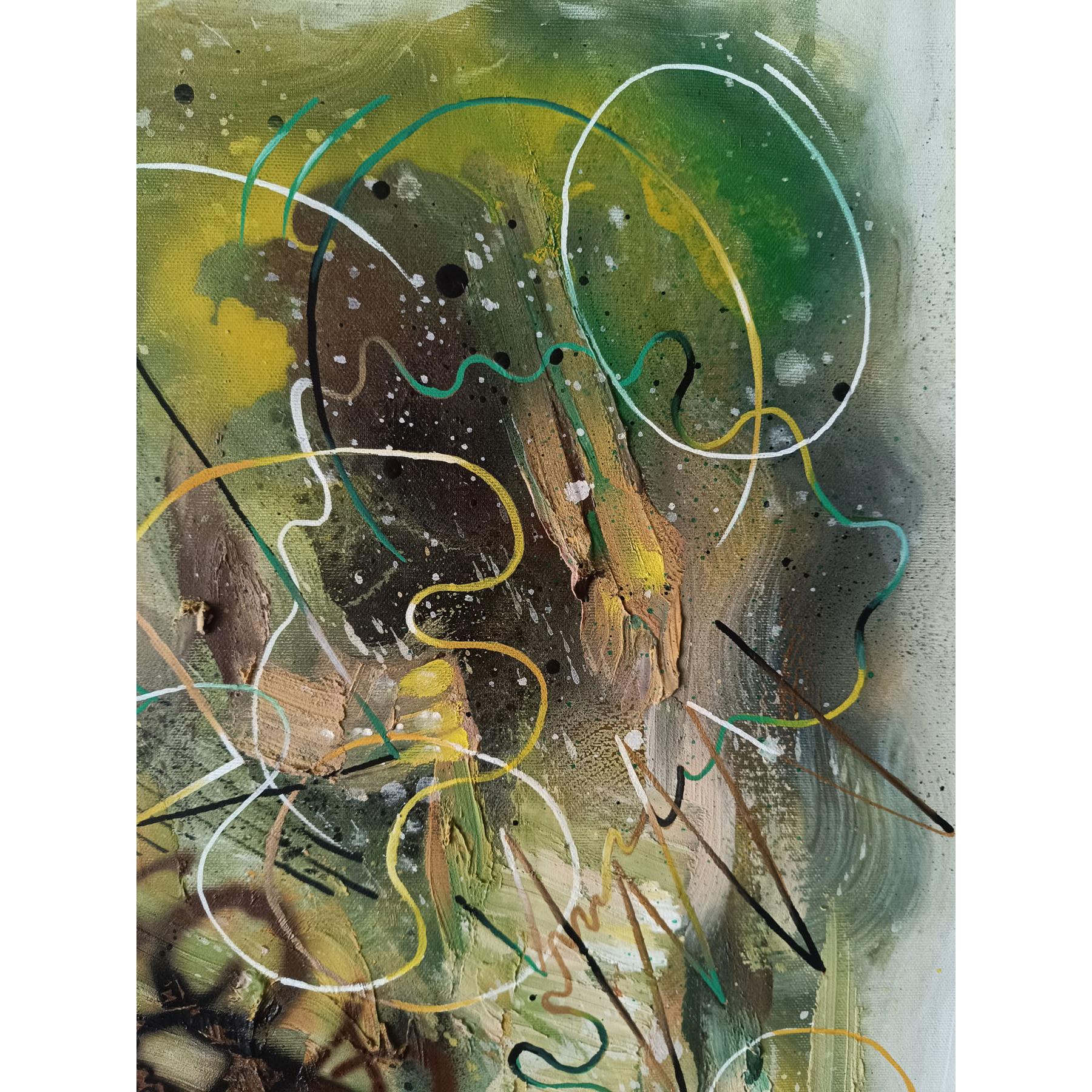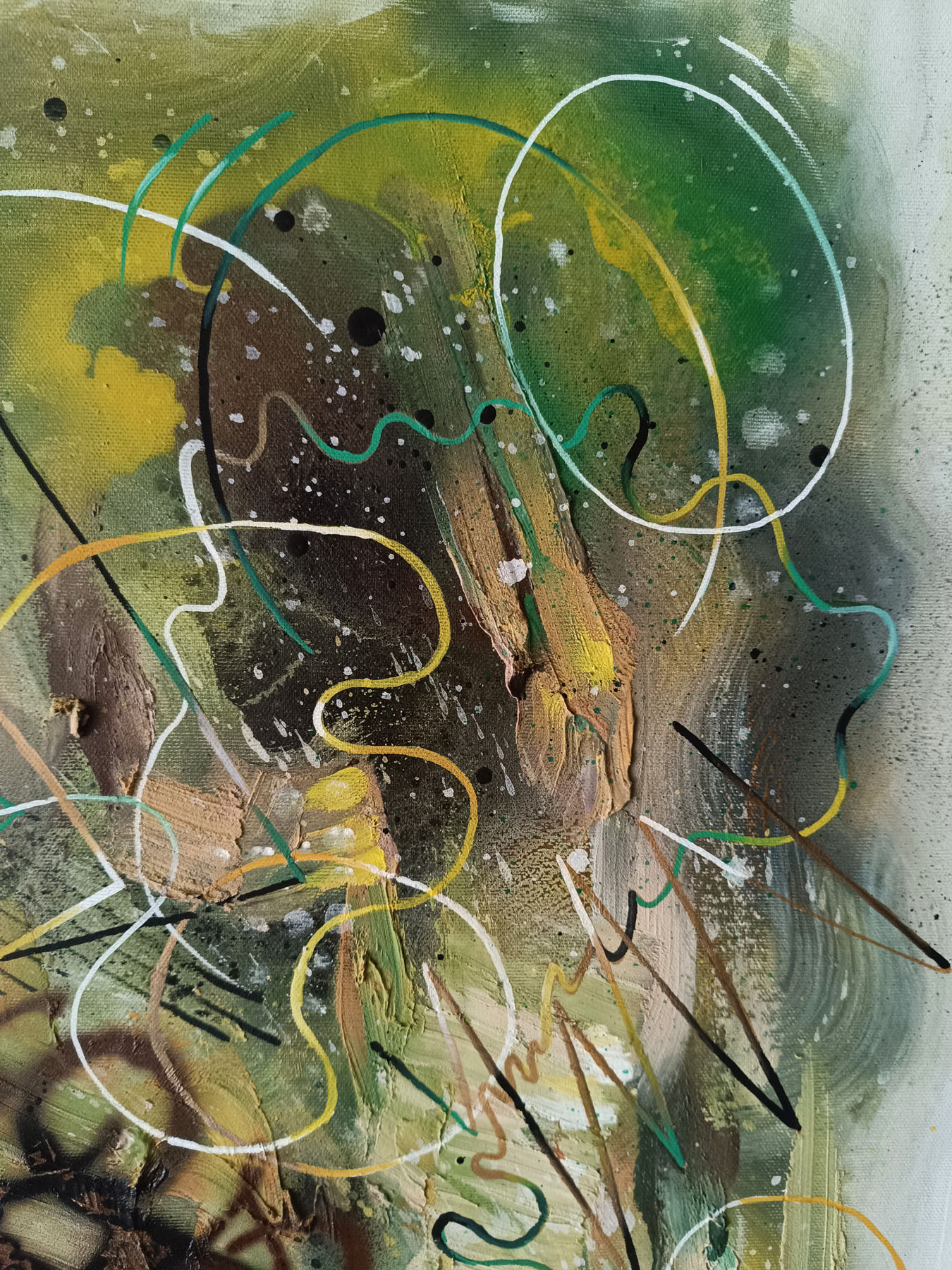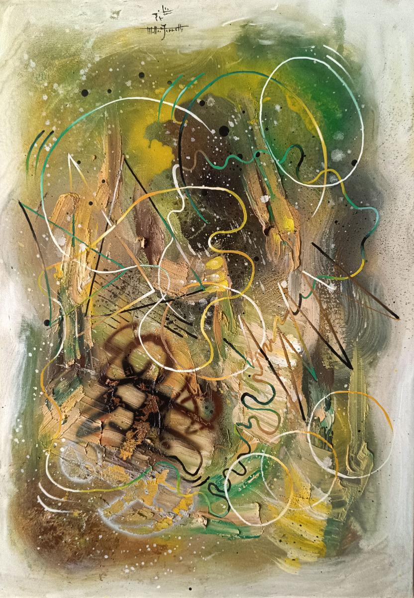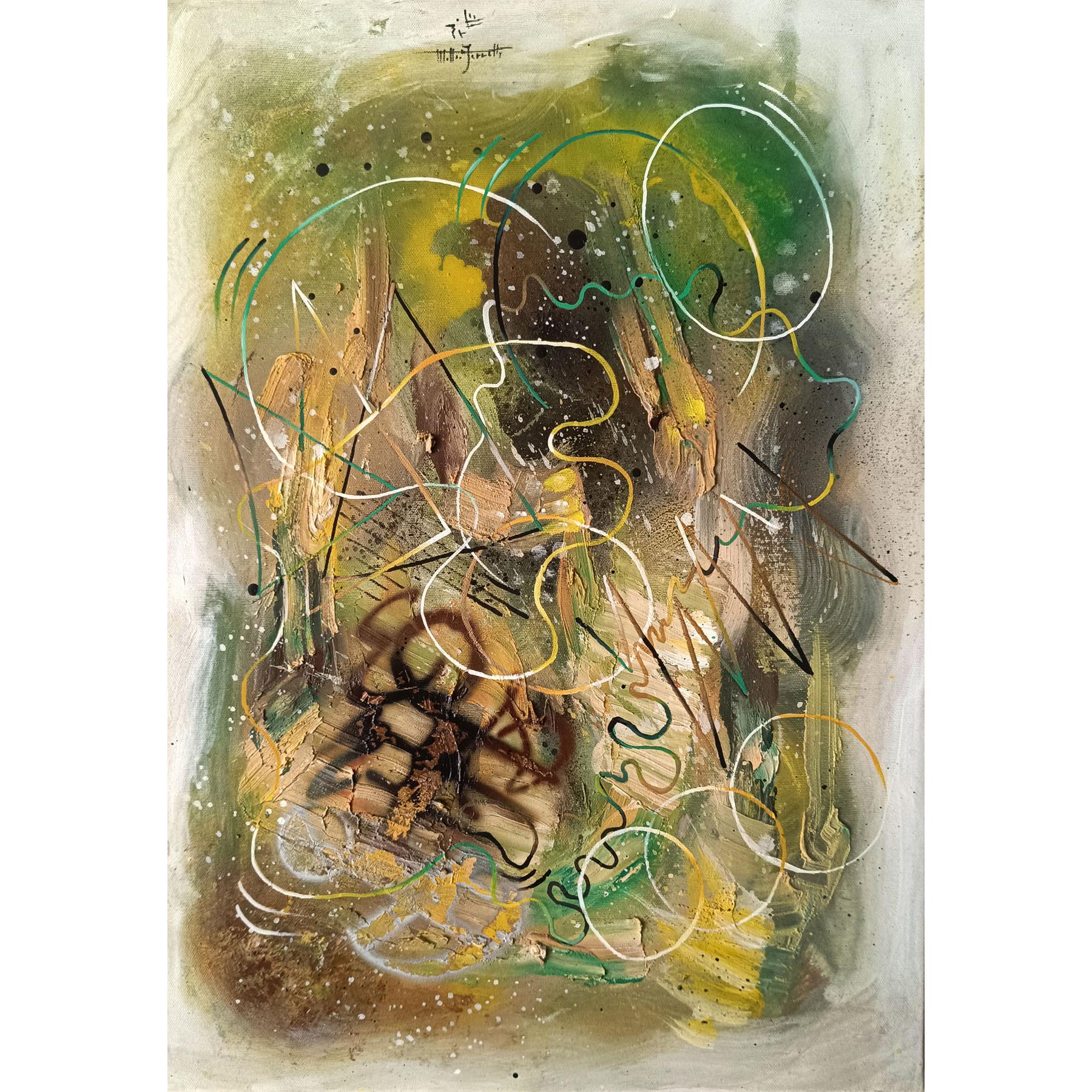 In Respiro della terra, il verde e l’ocra si fondono in un ritmopulsante che richiama il battito profondo del pianeta. Le linee fluide, quasinervose, evocano i movimenti invisibili che attraversano la vita — correnti dilinfa, vento, vibrazione.
