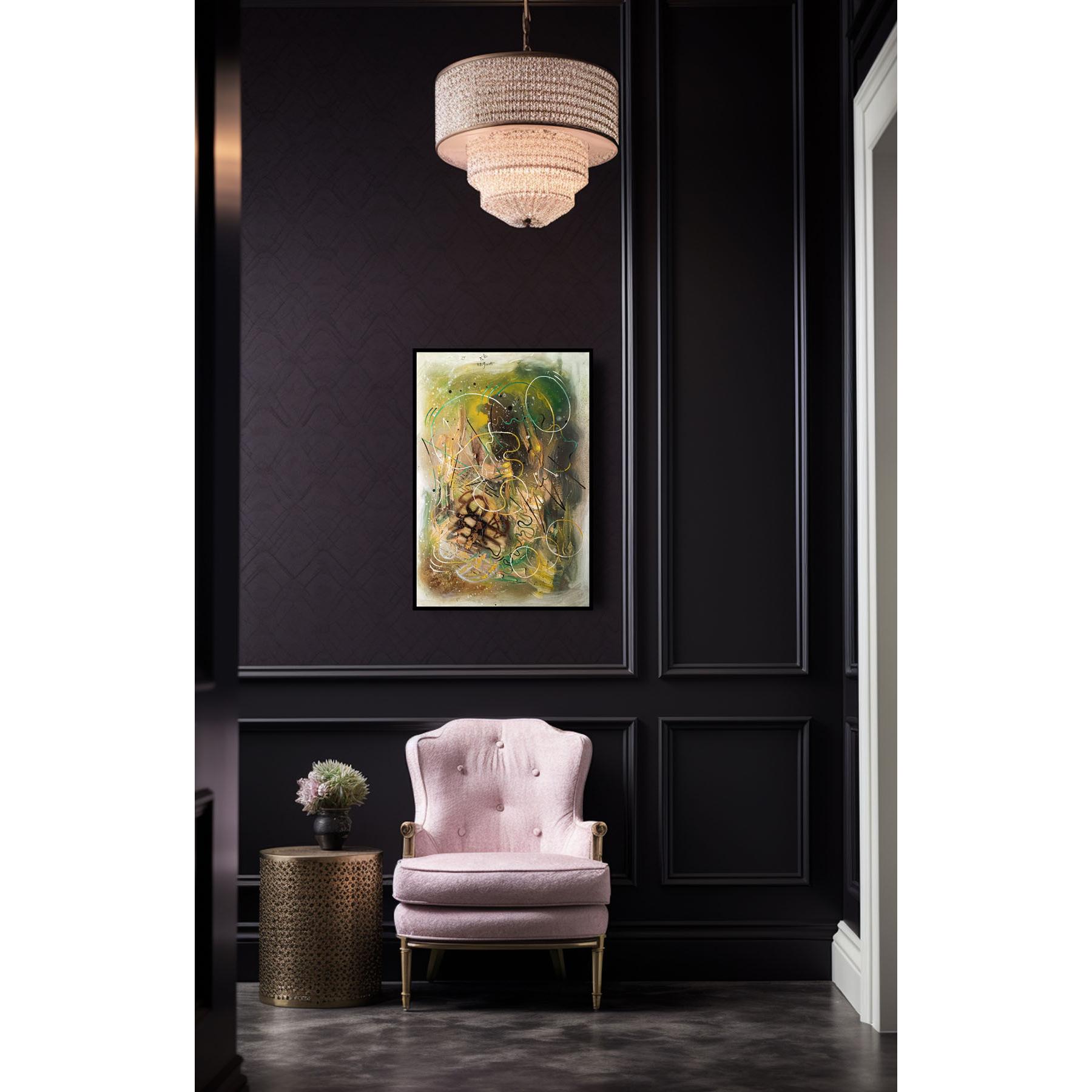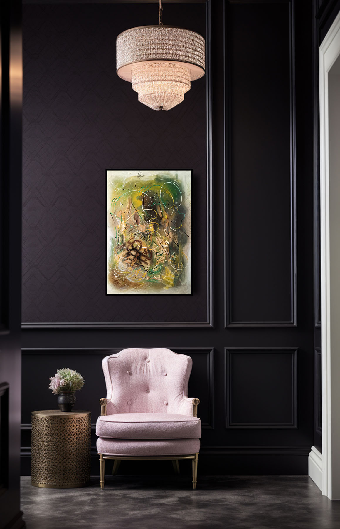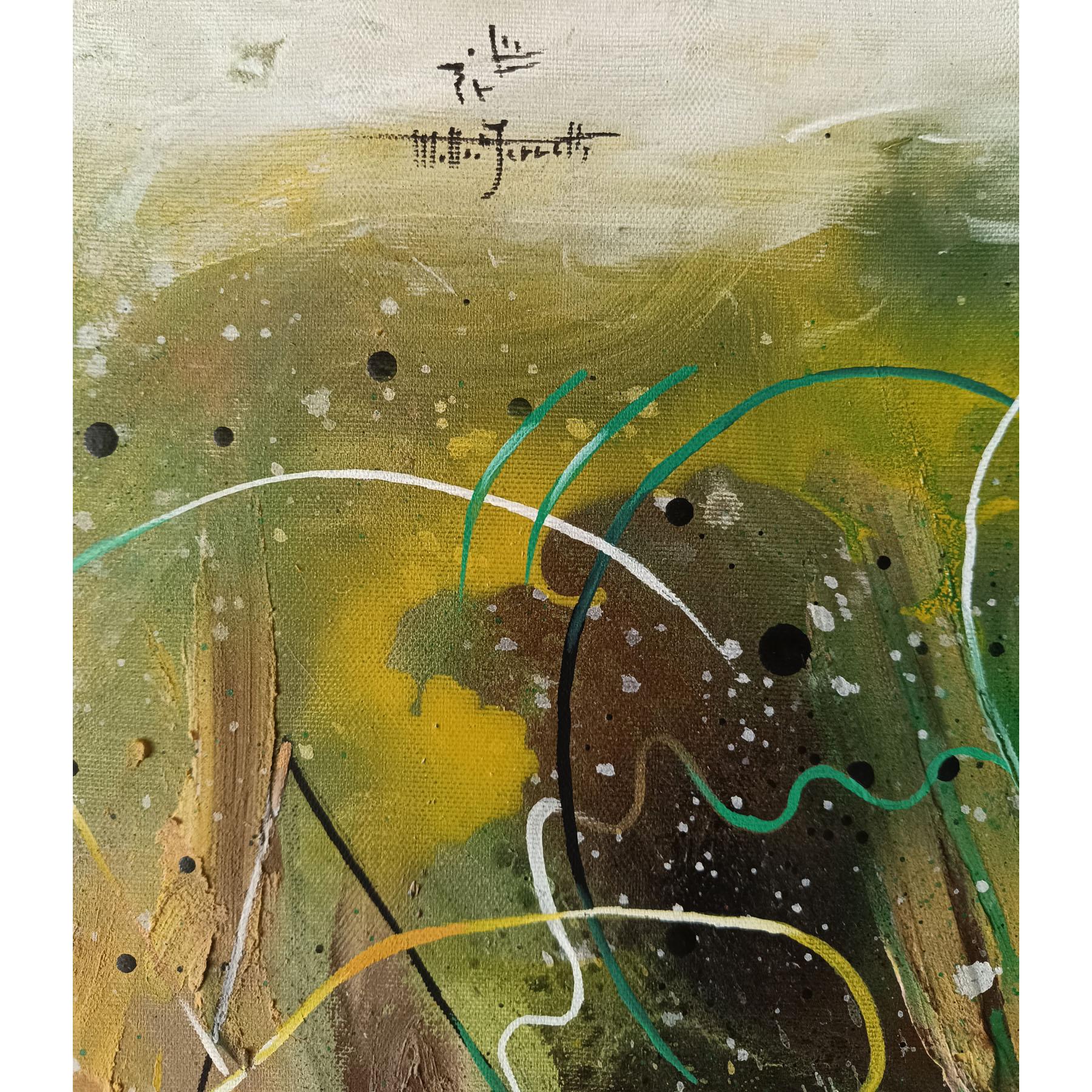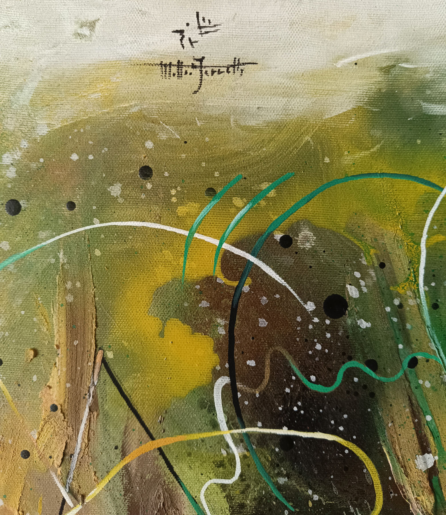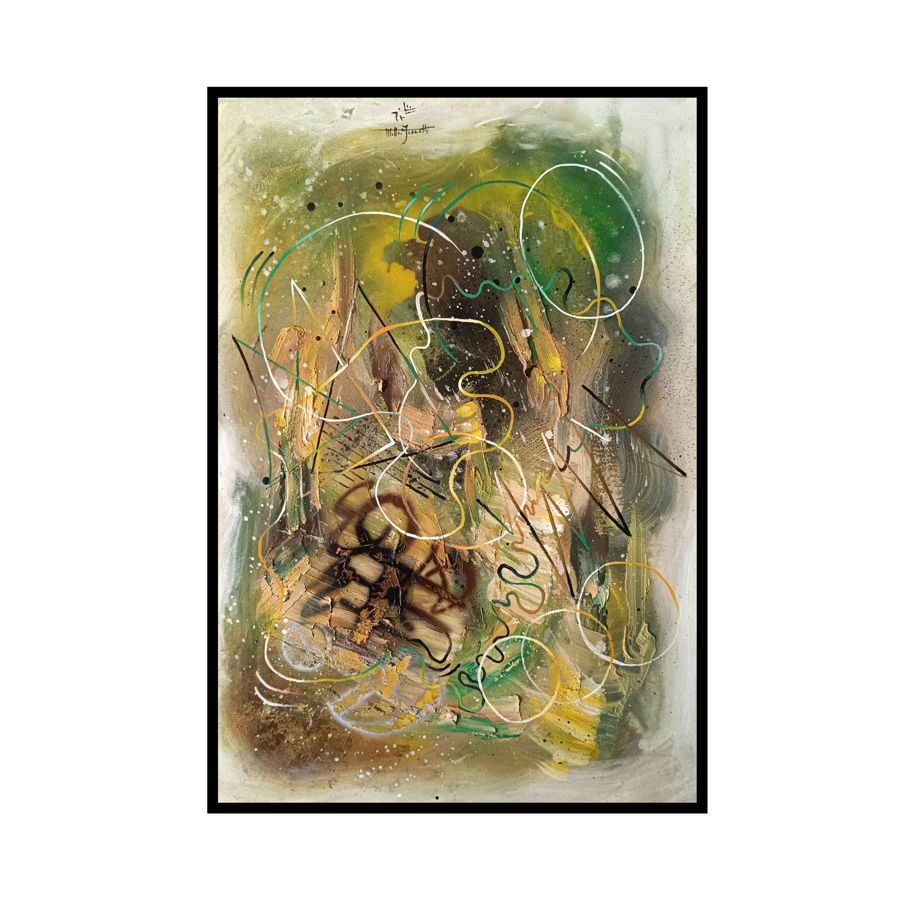 In Respiro della terra, il verde e l’ocra si fondono in un ritmopulsante che richiama il battito profondo del pianeta. Le linee fluide, quasinervose, evocano i movimenti invisibili che attraversano la vita — correnti dilinfa, vento, vibrazione.