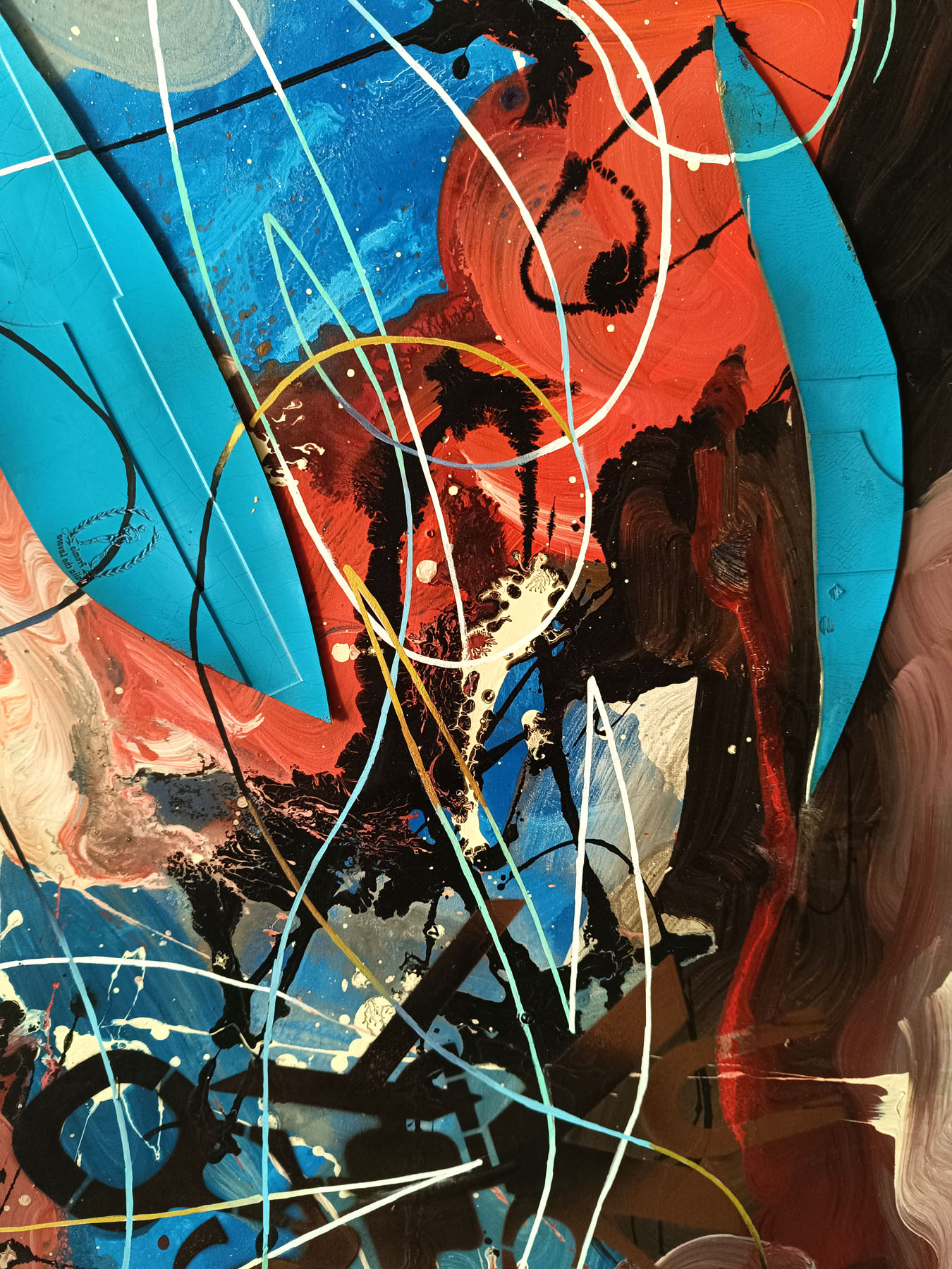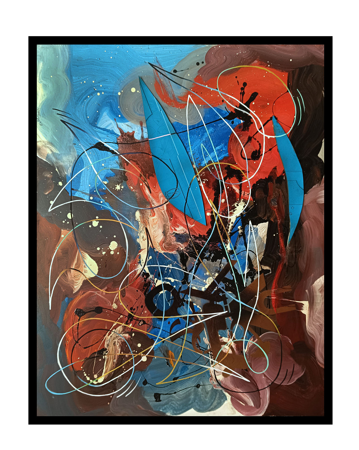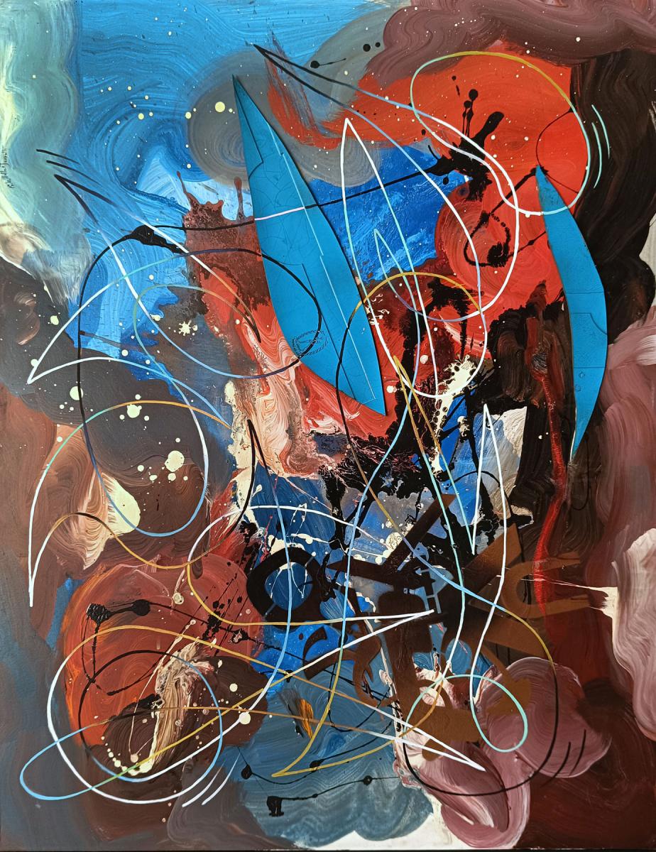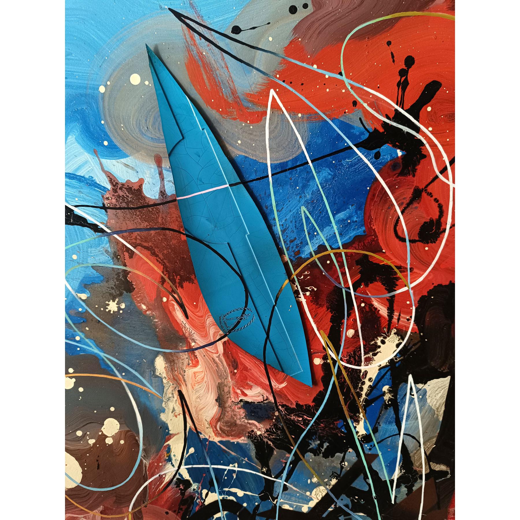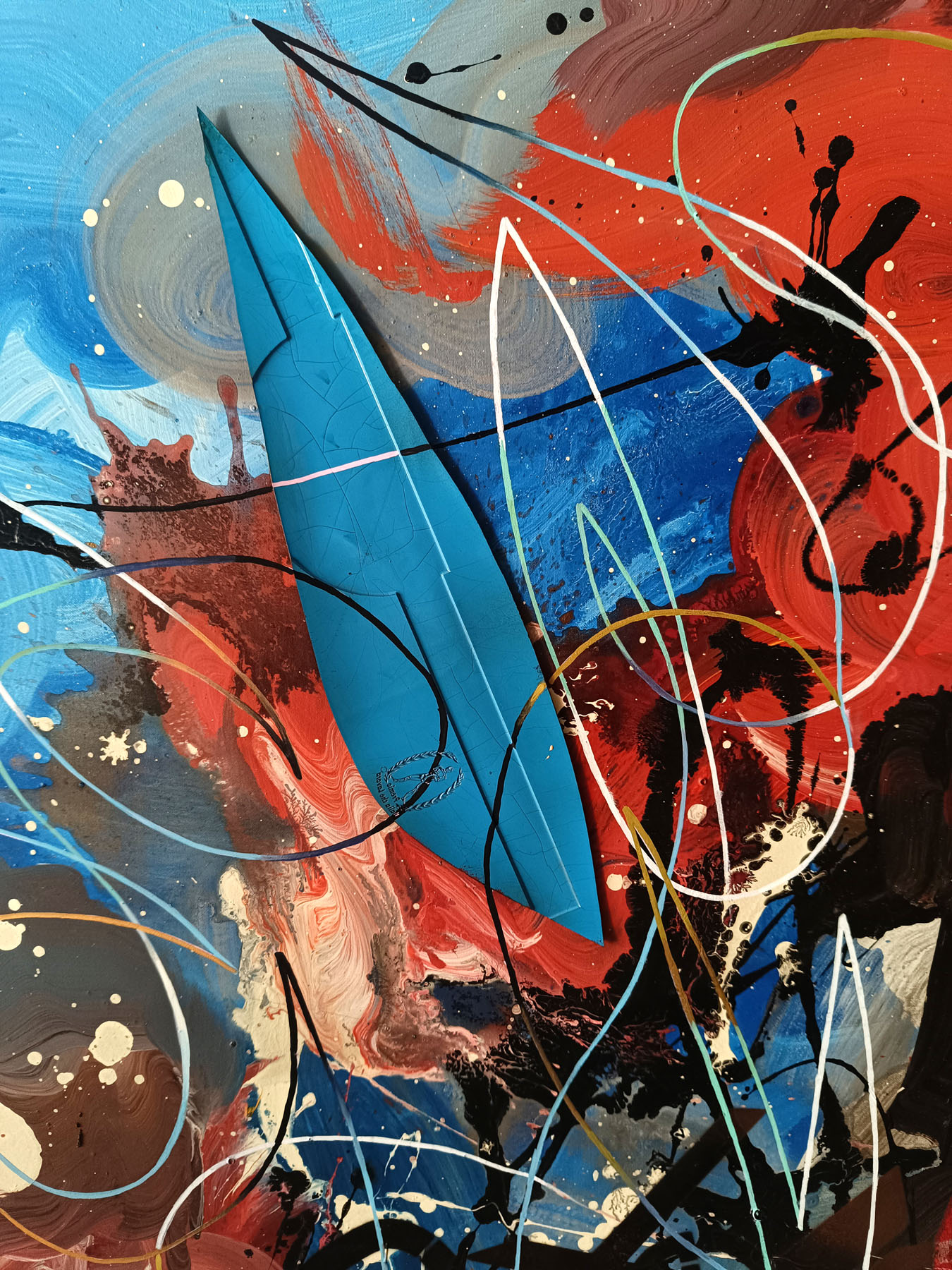 Blu e rosso dialogano come acqua e fuoco, caos e creazione.