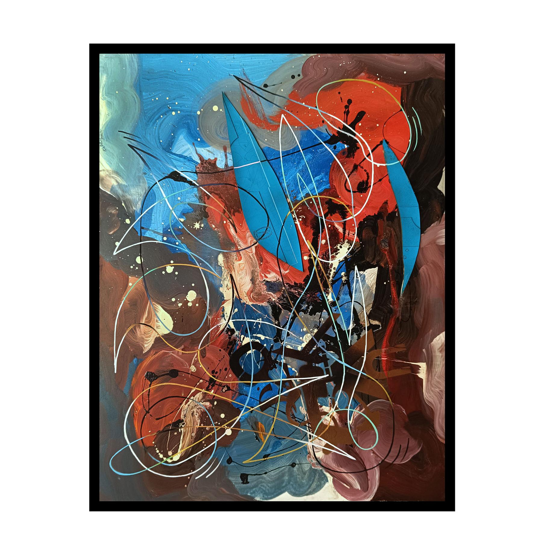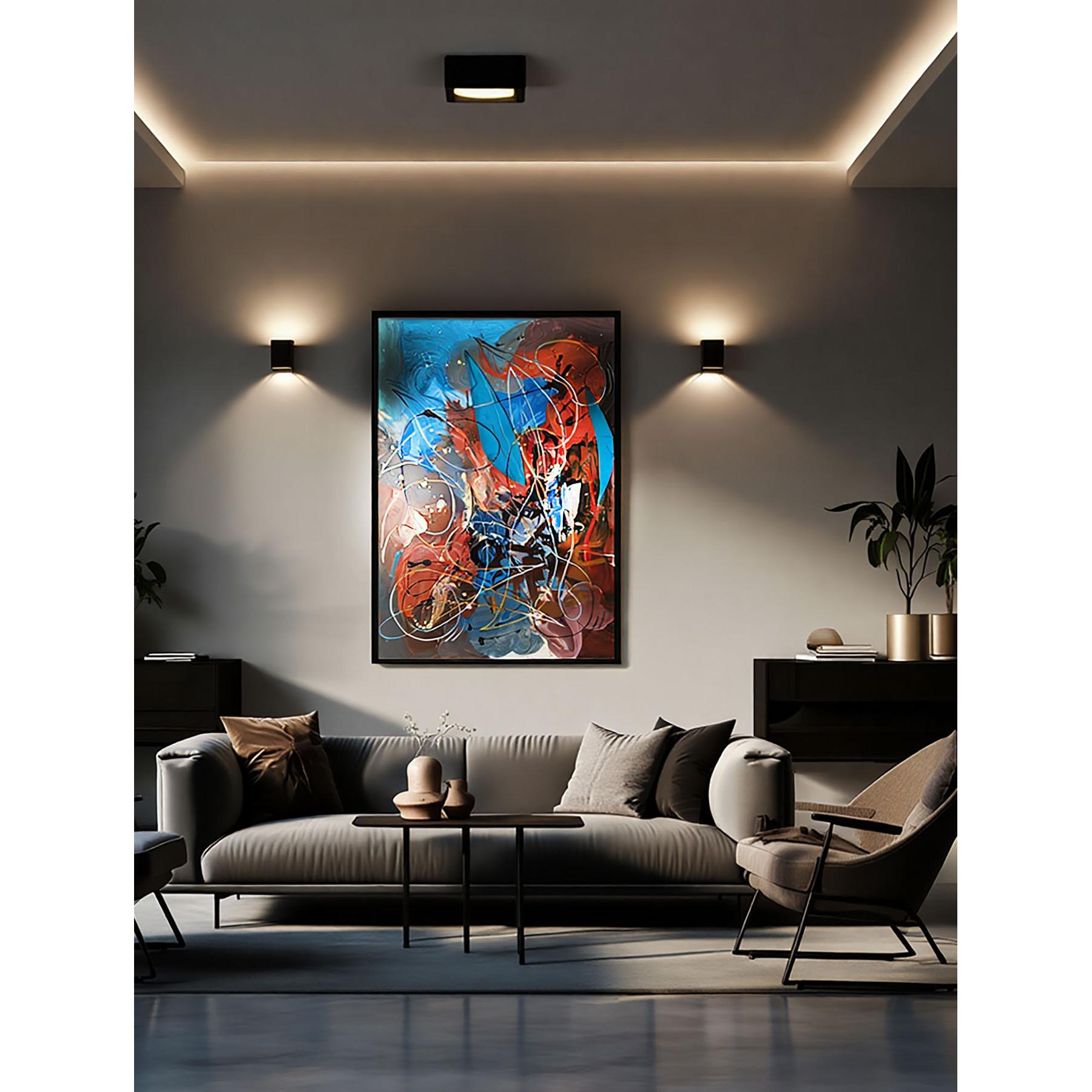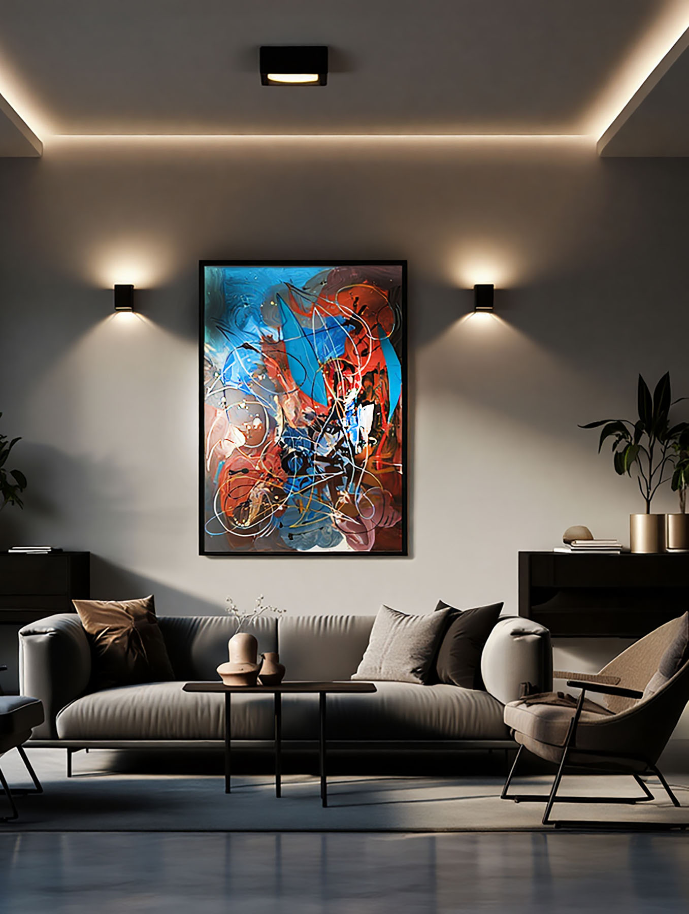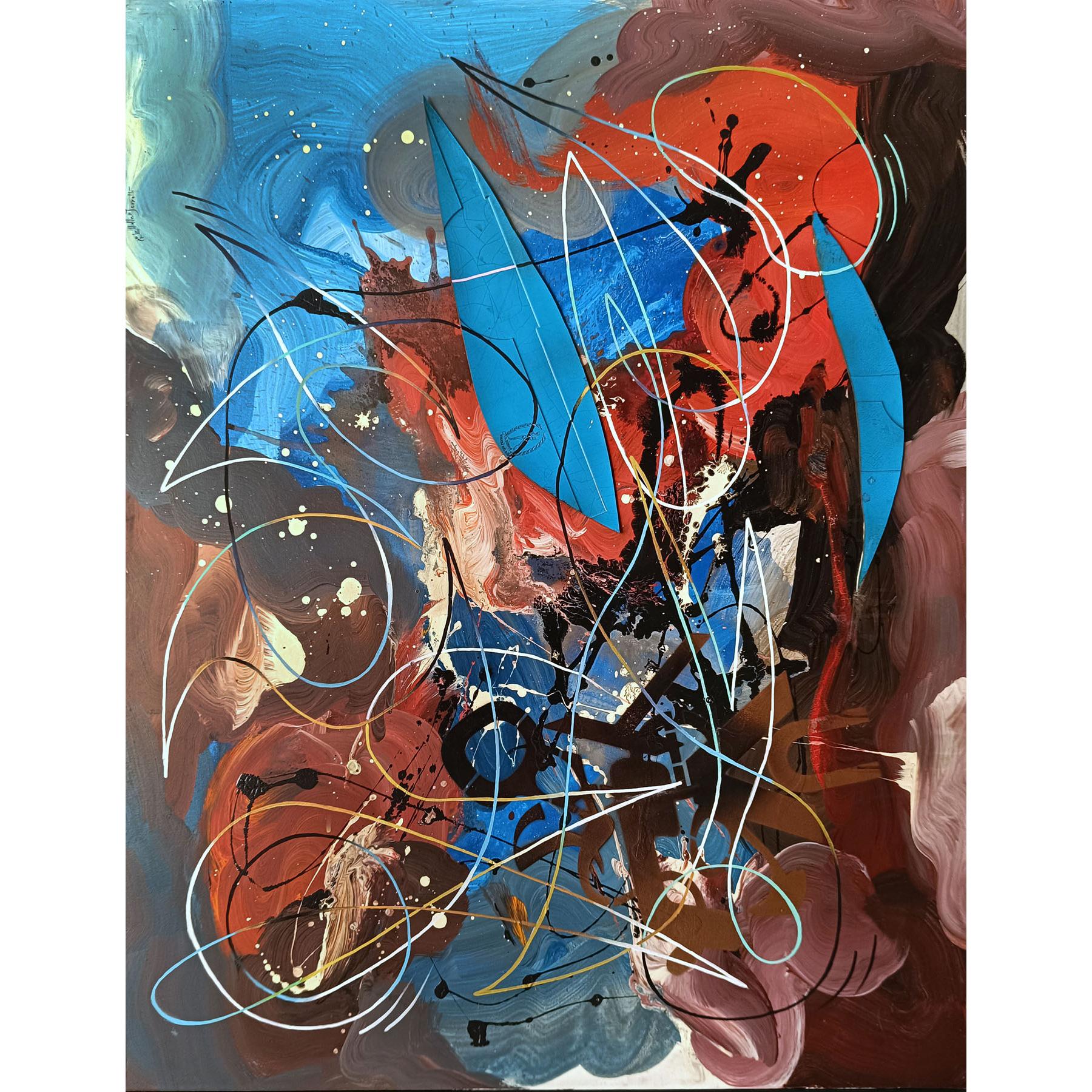 Blu e rosso dialogano come acqua e fuoco, caos e creazione.