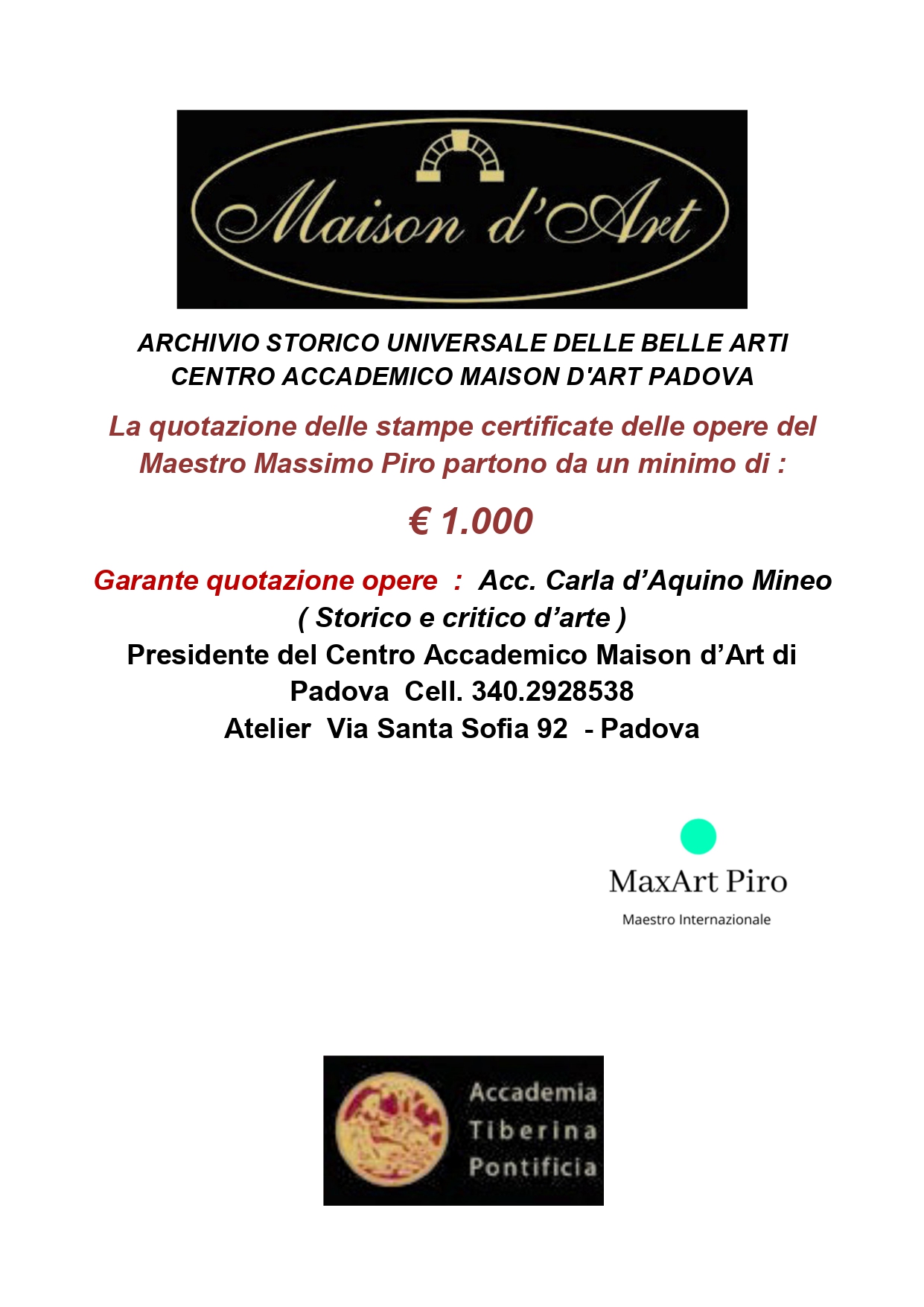 premiazioni - pubblicazioni in riviste dell'arte - mostre e inserimenti in biblioteche accademiche Artistiche ................................................................................................................................................................................................. - Opera inserita nella Biblioteca dell’Accademia Internazionale dei Dioscuri a Taranto -ha partecipato alla premiazione internazionale di diversi premi per il tour 2019 a Roma, Palazzo Marescotti del Vaticano MOSTRA ITINERANTE - I MAESTRI ITALIANI DEL COLORE 2018/2019 ................................................................................................................................................................................................. - a Dubai International Prix 2019, ................................................................................................................................................................................................. -a Rocca Imperiale, in Grecia 2019 INTERNATIONAL AWARD premio internazionale Achilleion ................................................................................................................................................................................................. - a Matera capitale della cultura Europea 2019 , ................................................................................................................................................................................................. - al gran premio internazionale antica Pompei Fauno D’oro 2019; ................................................................................................................................................................................................. Giornali che hanno dato risalto all'evento MOSTRA ITINERANTE - I MAESTRI ITALIANI DEL COLORE 2018/2019 con l'opera esposta ................................................................................................................................................................................................. - Corriere del Mezzogiorno - La Mostra Itinerante - I Maestri Italiani 0018/2019 nella capitale europea della cultura -Matera ( 02 marzo 2019 Anno 144 n° 52 ) ................................................................................................................................................................................................. - Corriere della Sera - La Mostra Itinerante - I Maestri Italiani 0018/2019 nella capitale europea della cultura -Matera ( 02 marzo 2019 Anno 144 n° 52 ) ................................................................................................................................................................................................. - L a Gazzetta del Mezzogiorno - Premio Internazionale Achilleion - ( 27 aprile 2019 ) ................................................................................................................................................................................................. - La Repubblica - l'Accademia Internazionale dei Dioscuri a Dubai - ( 09 maggio 2019 Anno 44 n° 109 ) ................................................................................................................................................................................................. - inserita nella biblioteca virtuale della Galleria la Chimera Metropolitan a Piazza Santo Oronzo a Lecce contribuendo a ottenere il diploma d’onore Città di New York 2019, ................................................................................................................................................................................................. - Inserita " nell'archivio storico Universale delle belle arti " del centro accademico Maison d'Arte Padova ................................................................................................................................................................................................. - inserita nella biblioteca dell’Accademia di Santa Sara di Alessandria 2019 ................................................................................................................................................................................................. - ARTEXPO PREMIO CITTA’ DI PARIGI 2019 dal 15 al 27 giugno 2019 Premio città di Parigi presso l’esclusiva Galleria Thuillier(13, rue de Thorigny – 75003 Paris), situata nel cuore del celebre quartiere Marais a pochi metri dal Museo Picasso. ................................................................................................................................................................................................. -GRAN TOUR INTERNAZIONALE EUROPEO 2018-2019 ................................................................................................................................................................................................. -ITINERARI DELL' ARTE CONTEMPORANEA Associazione Culturale ArtetrA PRIMO PREMIO INTERNAZIONALE GRAND TOUR European Immersive Experience Digital Exhibition - Trofeo - Primo Premio Internazionale “ Grand Tour “ 2018/2019 conferito a Massimo Piro – Max Art Piro - 15-22 Giugno 2019 Caput Mundi Premio Giulio Cesare - Palazzo Ferraioli –Roma Con l’opera “ Ritratto di Donna allo specchio “ ............................................................................................................................................................................................... 22-27 Novembre 2019 - Ammissione alla Biennale Internazionale Dell’Est Budapest ArtExpo – Galleria Pintér ( Falk Miksa u.10 Budapest ) - Conferimento premio città di Budapest con targa di merito artistico - Copia catalogo ArtNow - Attestato di partecipazione su pergamena con motivazione di selezione a cura del comitato scientifico ...............................................................