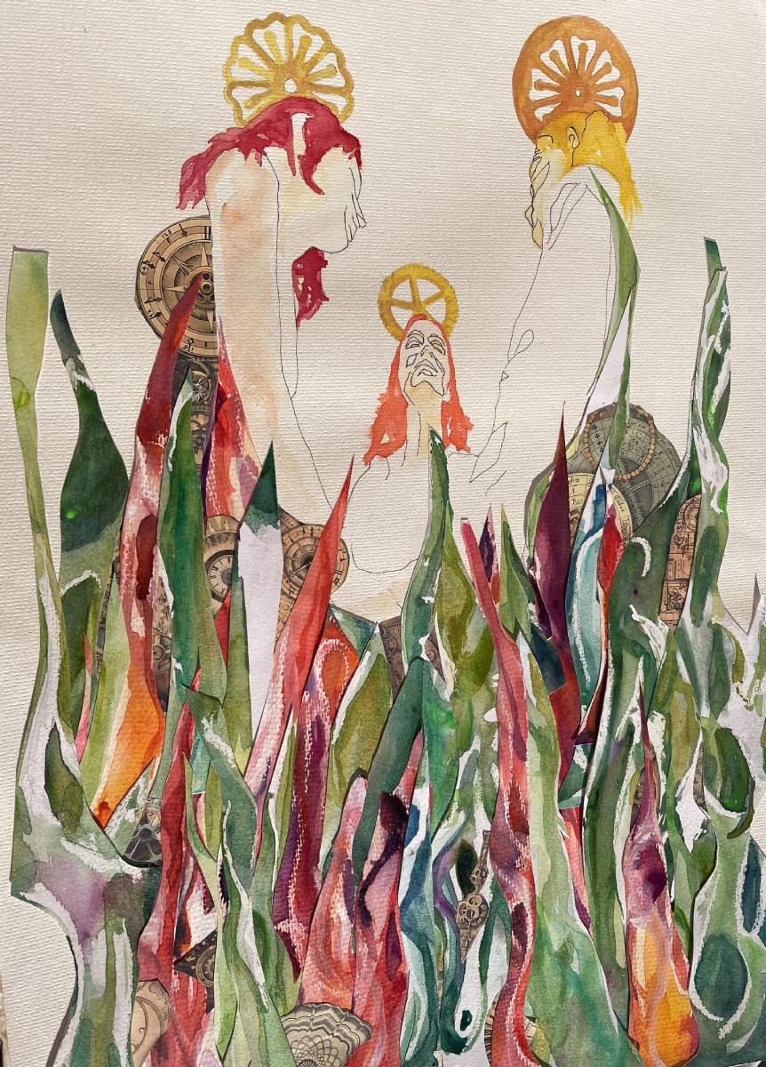 Tre giovani donne che si tengono per mano. Hanno delle aureole ma a forma di ghiera. Ai loro piedi, una natura ostile ma affascinante, come foglie aculee fatte di fuoco e speranza.