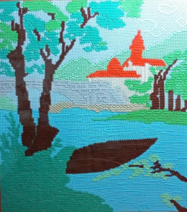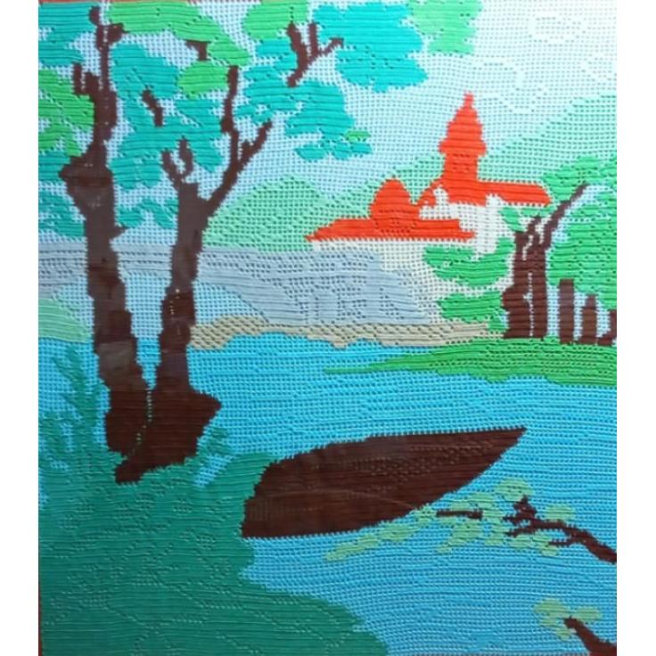 La tela raffigura un paesaggio . Per cercare di dare più movimento possibile al quadro,ho cambiato più volte colore. Soprattutto negli alberi ho usato varie tonalità di verde,per ricreare le tonalità con le zone di ombra e i punti in cui le foglie vengono colpite dalla luce del sole. Il materiale utilizzato è il cotone.