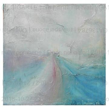 Onde nel Cielo è un'opera leggera, rilassante, nei colori, nella forma e nel contenuto. i colori tenui ma in alcuni punti intensi rilassano lo sguardo accompagnandolo verso un punto di fuga centrale. Nel movimento della tela si sprigiona un vortice di energia dove tutto ruota e si muove con calma e armonia. Gli spazi interiori corrispondono a quelli esterni e aria, acqua, terra, luce si fondono e si concentrano insieme creando un mandala materico e fluttuante.