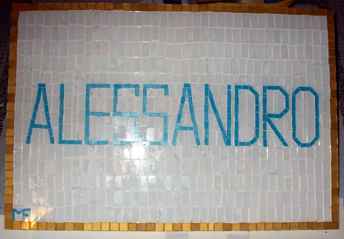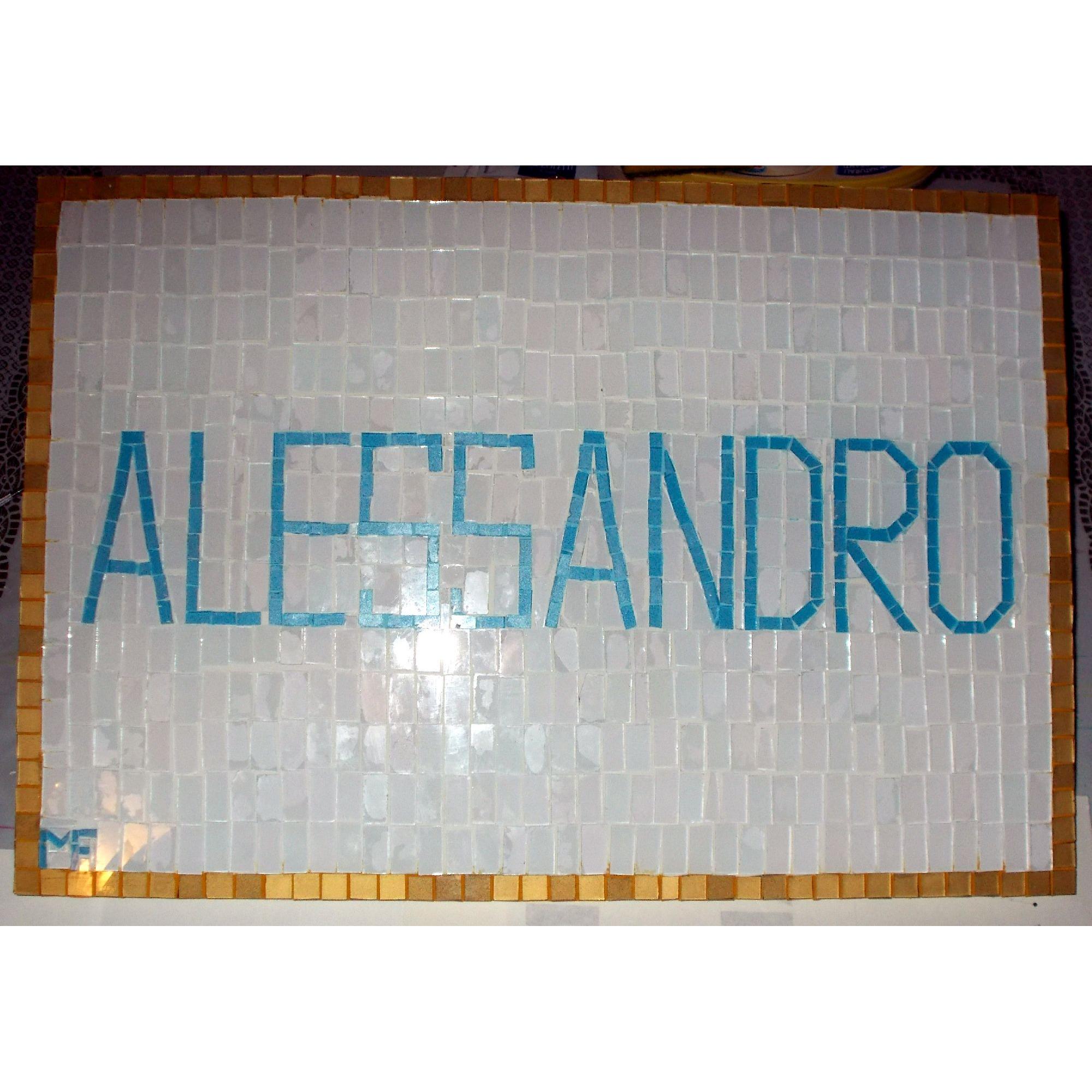 Mosaico artigianale in vetro con gancio. Scritta Alessandro. Colori: scritta blu cielo, fondo bianco, cornice oro pallido