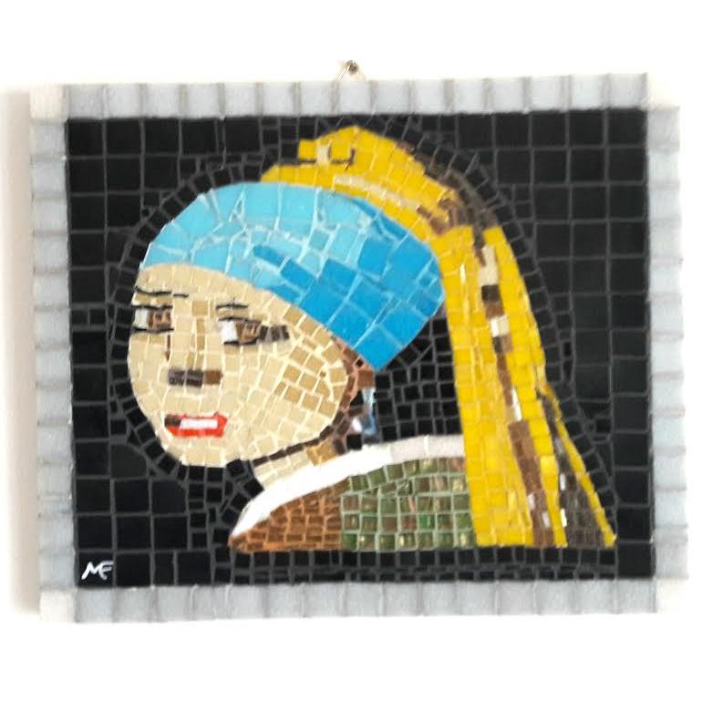 Tributo a la ragazza col turbante (orecchino di perla). mosaico in pasta vitrea su base lignea.