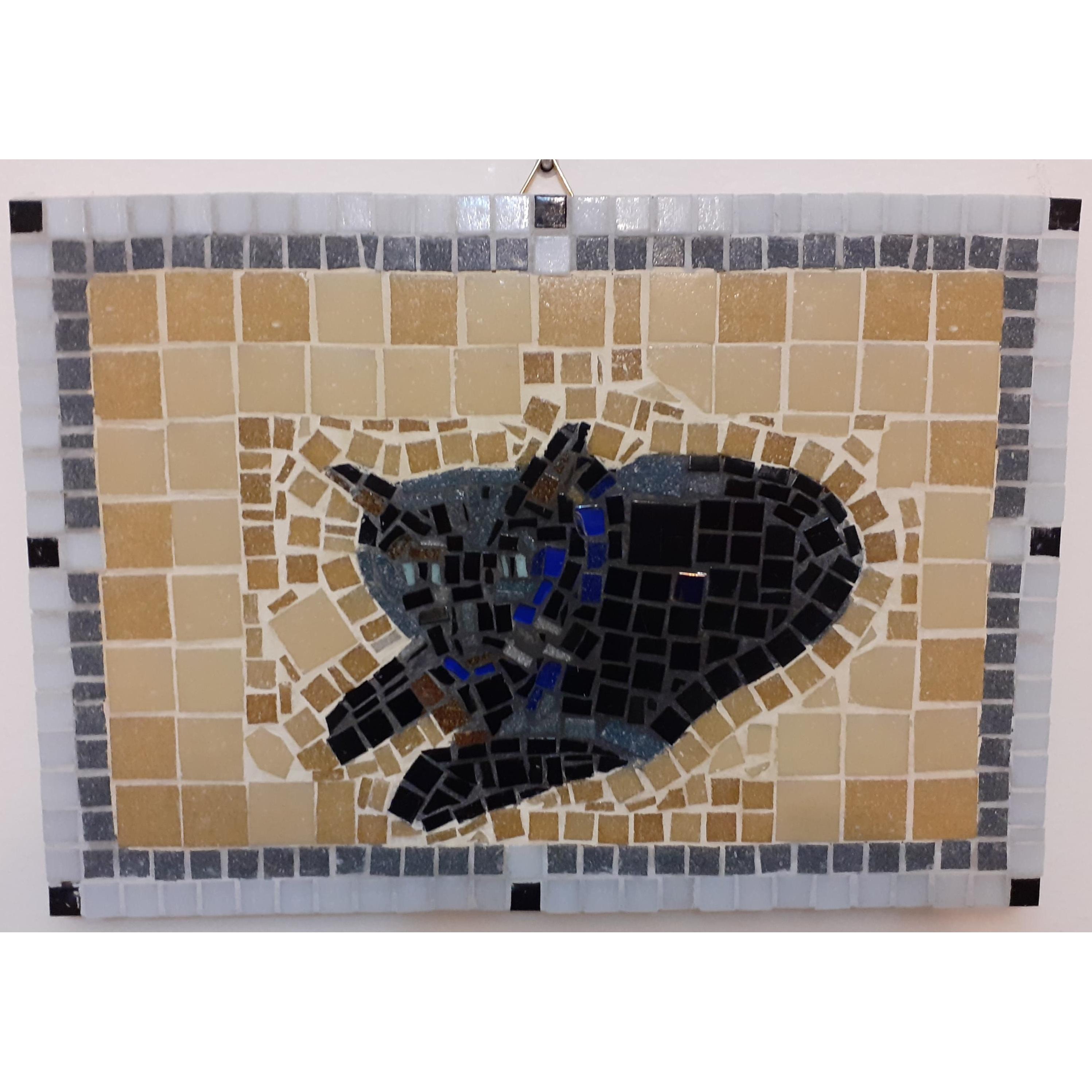 Black cat. Mosaico in pasta vitrea su base lignea. Con gancio per chiodo.