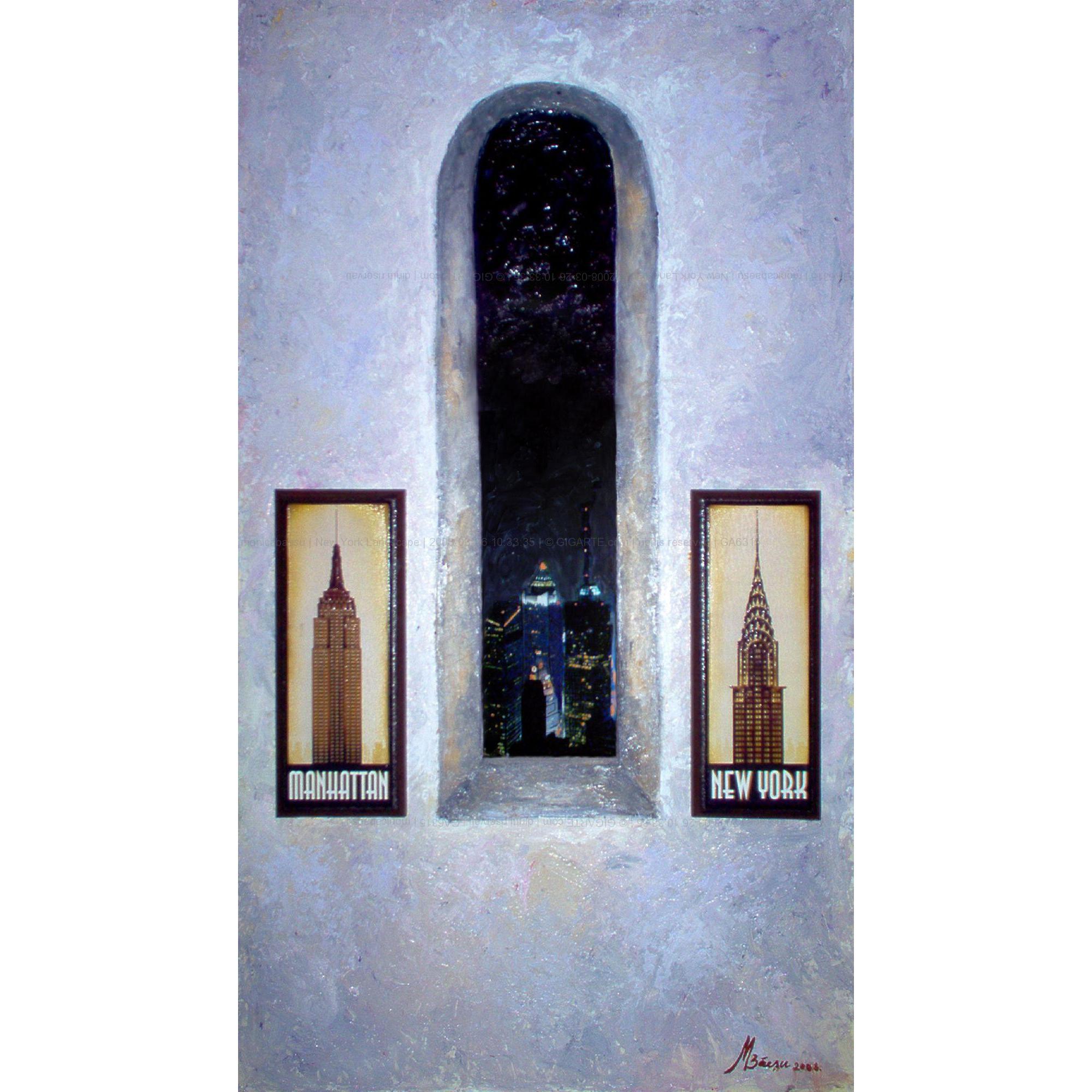 A beautifull landscape where that 2 paintings with Crysler Building and Empire State Building are 2 artprint on wood maunted on the real work.Is painting in painting and the landscape is visible trough the window.
