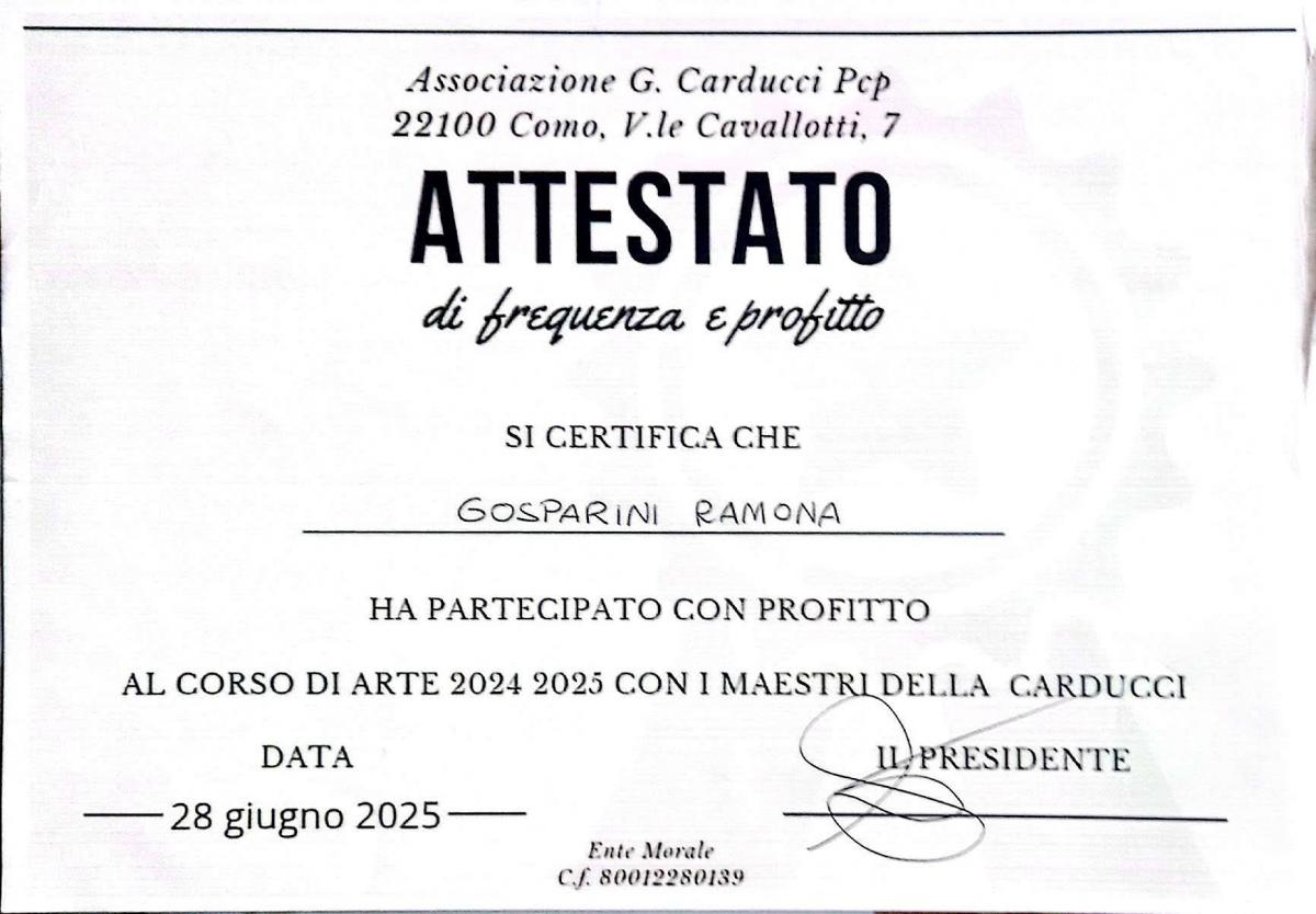 Giugno 2025: Per la prima volta quest'anno ho ricevuto l'attestato di frequenza dei corsi della Carducci