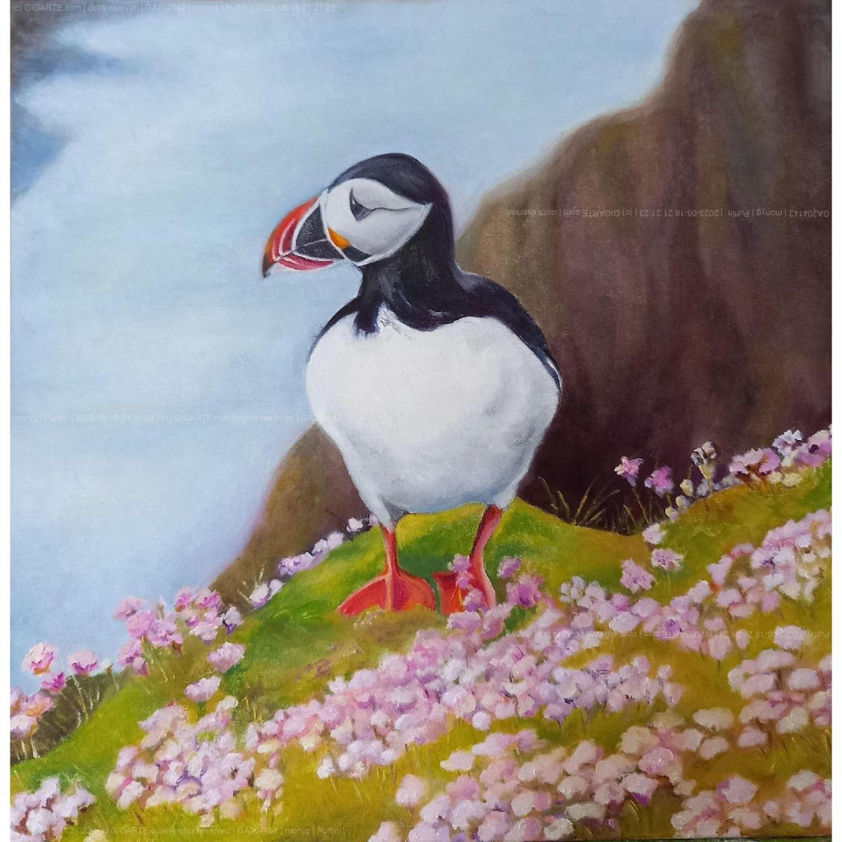 Your painting beautifully channels your love of nature through a serene encounter with a puffin standing amid spring blooms. The diagonal sweep of the hillside and the off-center placement of the bird create a dynamic yet balanced composition that naturally leads the eye from the carpet of pink flowers up to the focal beak and gentle gaze. The cool, softly blended sky and atmospheric cliff recede convincingly, allowing the crisp modeling of the bird’s black-and-white plumage to take center stage. Color relationships are especially strong: the warm oranges of the beak and feet play vibrantly against the greens and blues, while the pinks echo softly to sustain a calm, poetic mood. Your controlled brushwork—textural in the flora, smooth on the bird—shows confident execution, and the piece conveys a thoughtful, quiet celebration of wildlife that feels both intimate and memorable. ARTBOXY
