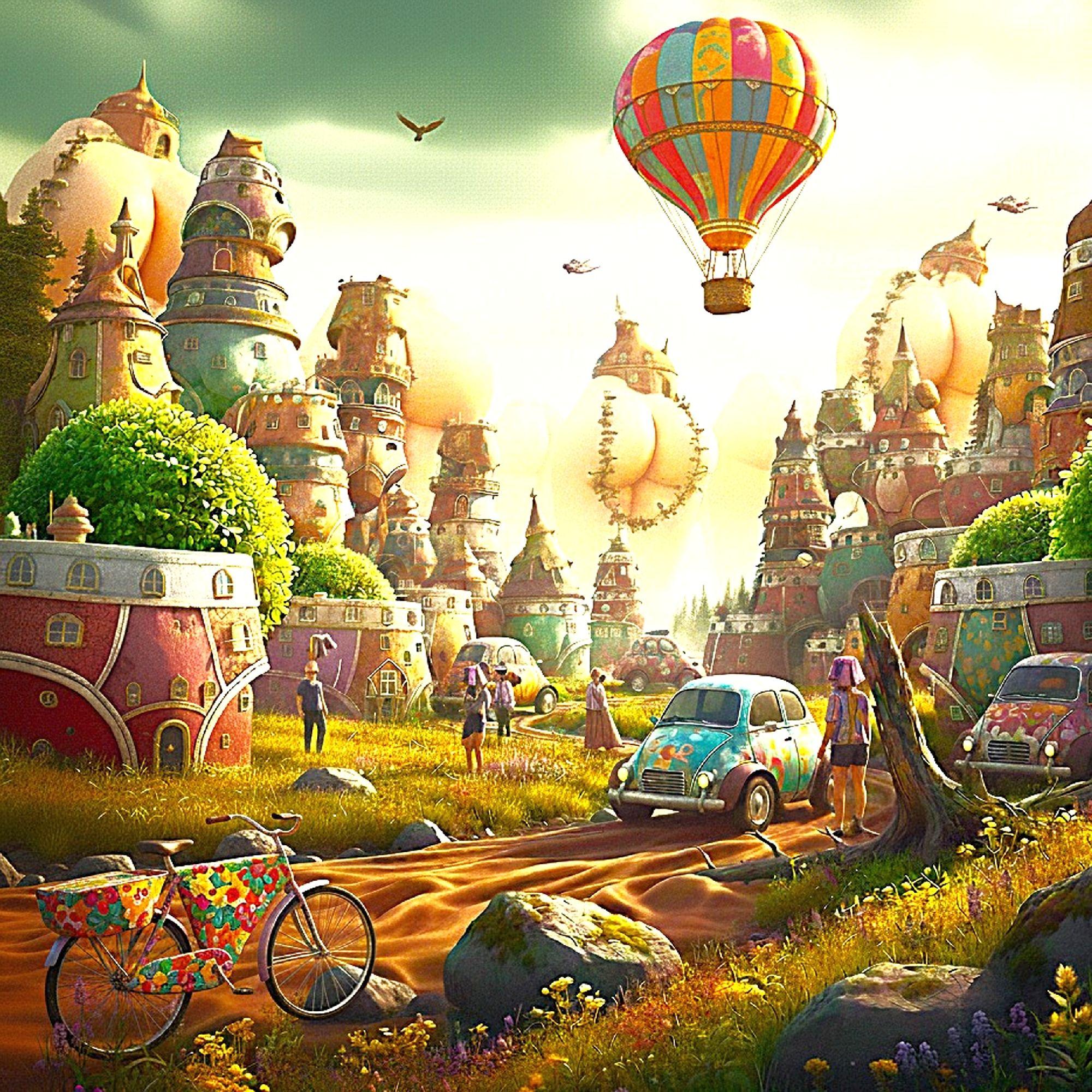 Composizione Dinamica: La scena è bilanciata tra il primo piano denso e floreale (bicicletta e auto) e lo sfondo verticale dominato dalle torri. La linea diagonale del sentiero e l'ascesa della mongolfiera creano un moto verso l'alto e in avanti, suggerendo un cammino, un viaggio, o appunto, un'ascensione.