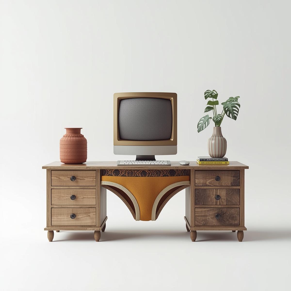 Composizione e Tensione: La composizione crea una tensione diretta tra l'ordine e la razionalità (la struttura rettangolare, i cassetti allineati, il monitor centrato) e l'irrazionalità e l'intimità esposta (l'indumento). Lo sguardo è inevitabilmente attratto dal contrasto tra il legno rigido e il tessuto morbido, tra la funzione pubblica della scrivania e l'allusione sessuale/personale dell'indumento.