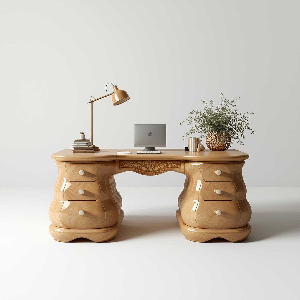 Hybrid Ornamentation: The central carving (below the tabletop) evokes the floral ornamentation or arabesque typical of antique furniture. However, this decorative detail is embedded within a structure so voluminous and almost cartoonish that it becomes ironic, creating tension between the historical detail and the audacity of the overall form.
