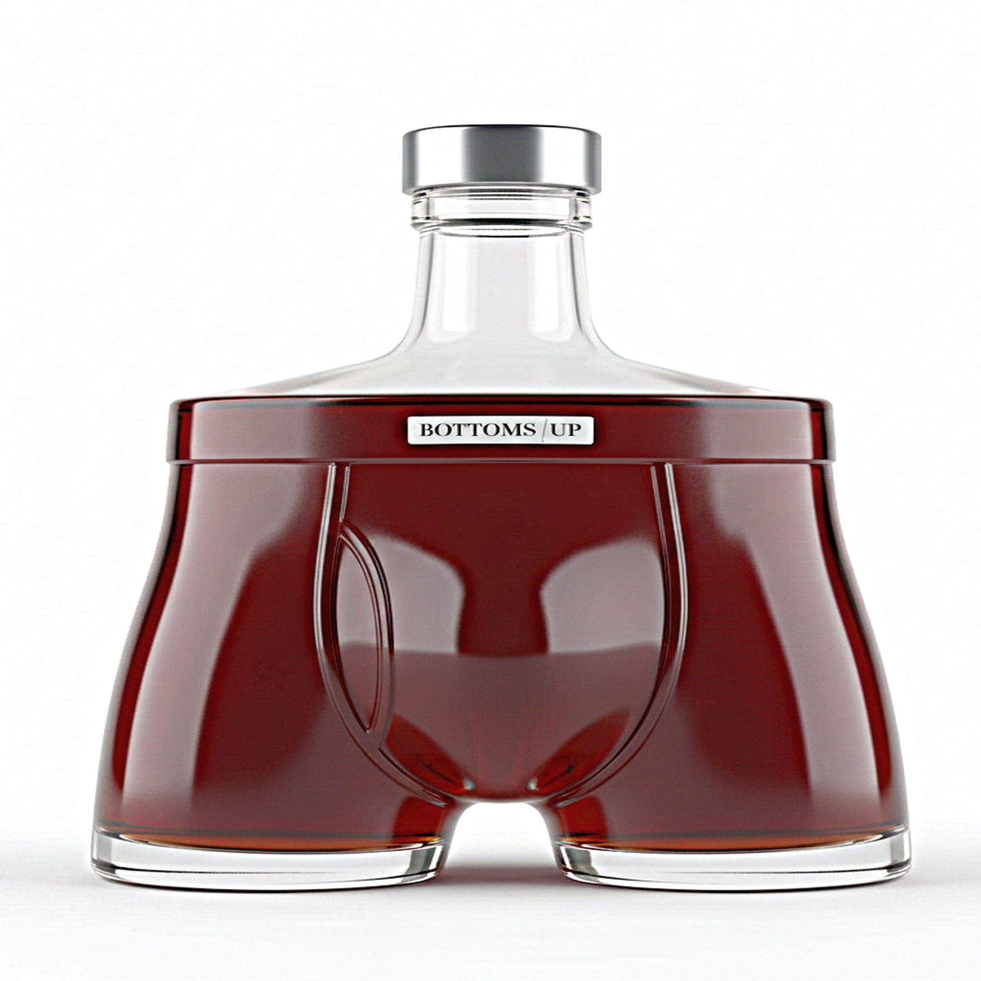 L'Oggetto: Una bottiglia-decanter in vetro trasparente, contenente un distillato ambrato (probabilmente whisky o cognac). La forma ricalca quella di uno slip/boxer maschile, con una resa anatomica stilizzata ma evidente.