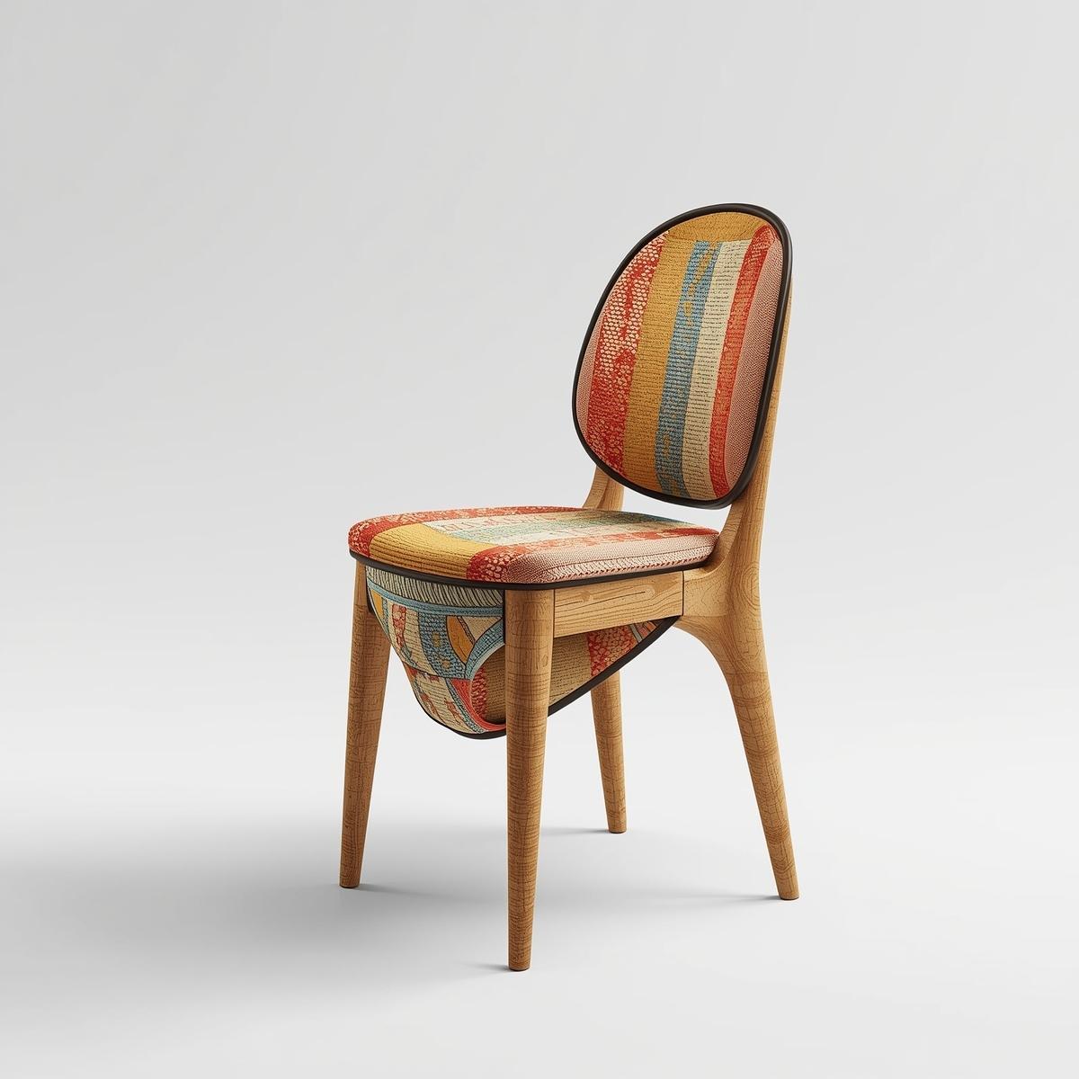 Materiali a Contrasto: Vi è una tensione visiva tra la struttura lignea (apparentemente in essenza chiara come faggio o noce, lavorata con curve sinuose che rifiutano l'ortogonalità) e l'inserto tessile. Il legno nobile suggerisce stabilità e tradizione (l'artigianato di alta ebanisteria), mentre il tessuto, fortemente variegato, kitsch e pop, introduce l'elemento dirompente e intimo.