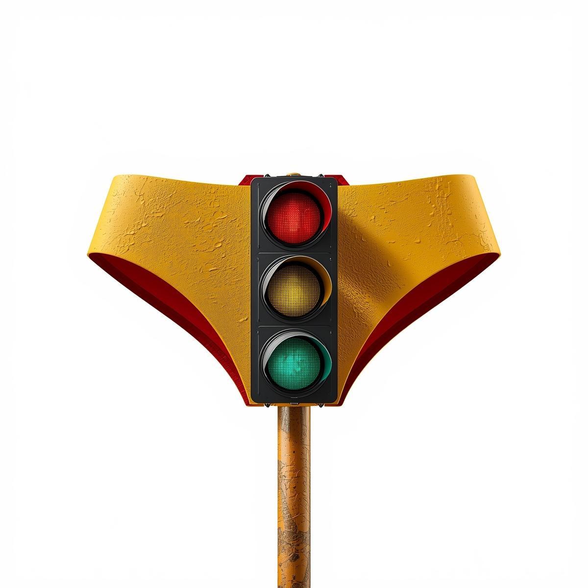 Intimità vs. Funzione Pubblica: La mutanda è l'ultima barriera tra il corpo privato e il mondo. Il semaforo è l'emblema della regola pubblica, della circolazione e del controllo. La loro fusione è un cortocircuito concettuale che espone il privato nel massimo luogo della regolamentazione sociale.