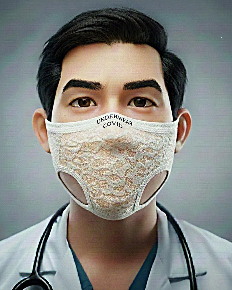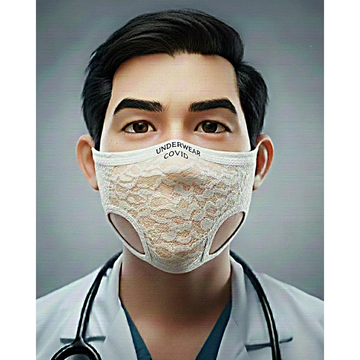 Il Testo: La scritta "UNDERWEAR COVID" esplicita il paradosso. Trasforma un presidio medico in un accessorio di biancheria, suggerendo una critica alla gestione della pandemia come forma di "vestizione" sociale forzata.