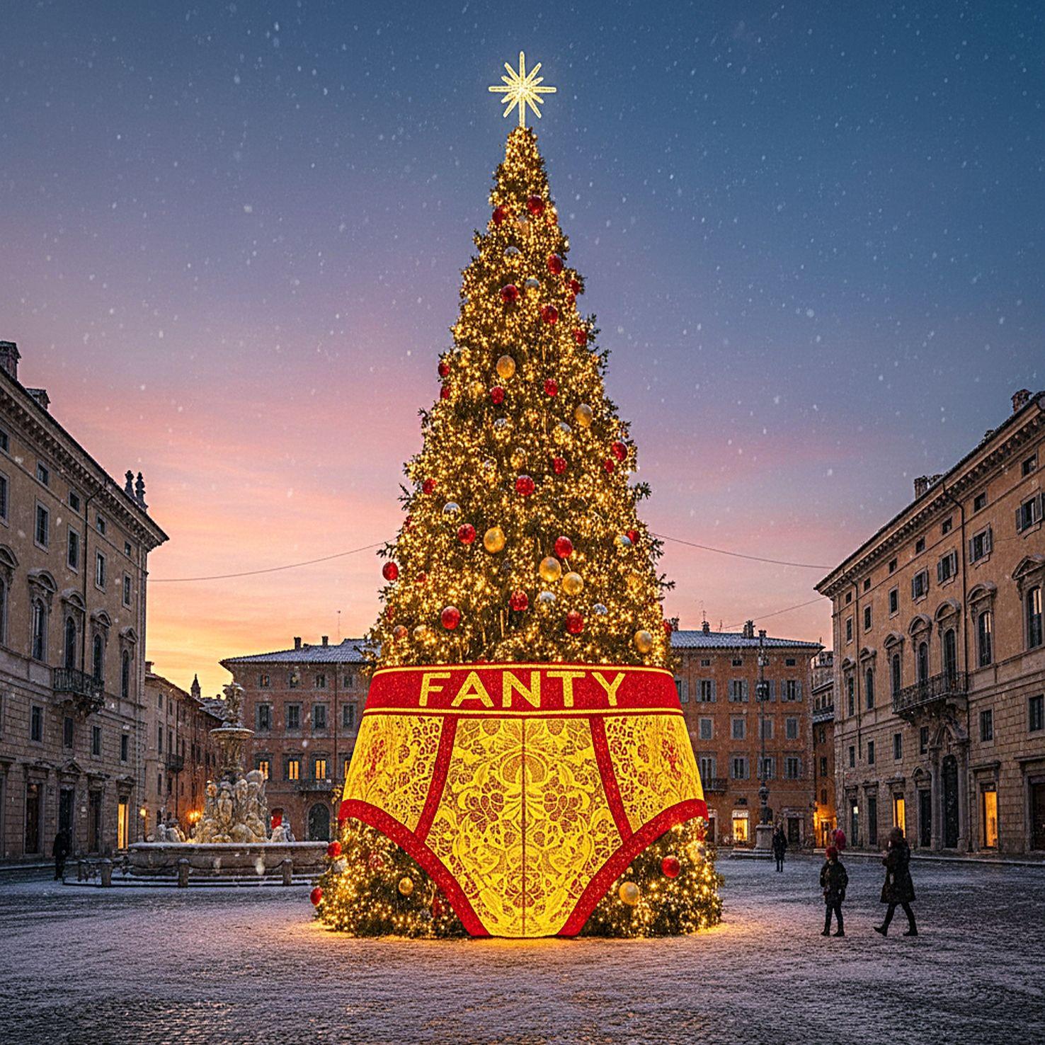 Questa installazione di "Fanty" può essere interpretata come una dissacrazione ironica. Se da un lato celebra la creatività del marketing moderno, dall'altro mette a nudo (letteralmente) la natura transazionale delle nostre piazze contemporanee. L'albero non è più un simbolo di speranza, ma un corpo esposto, un feticcio commerciale che usa la luce del Natale per vendere un'identità legata al consumo intimo.