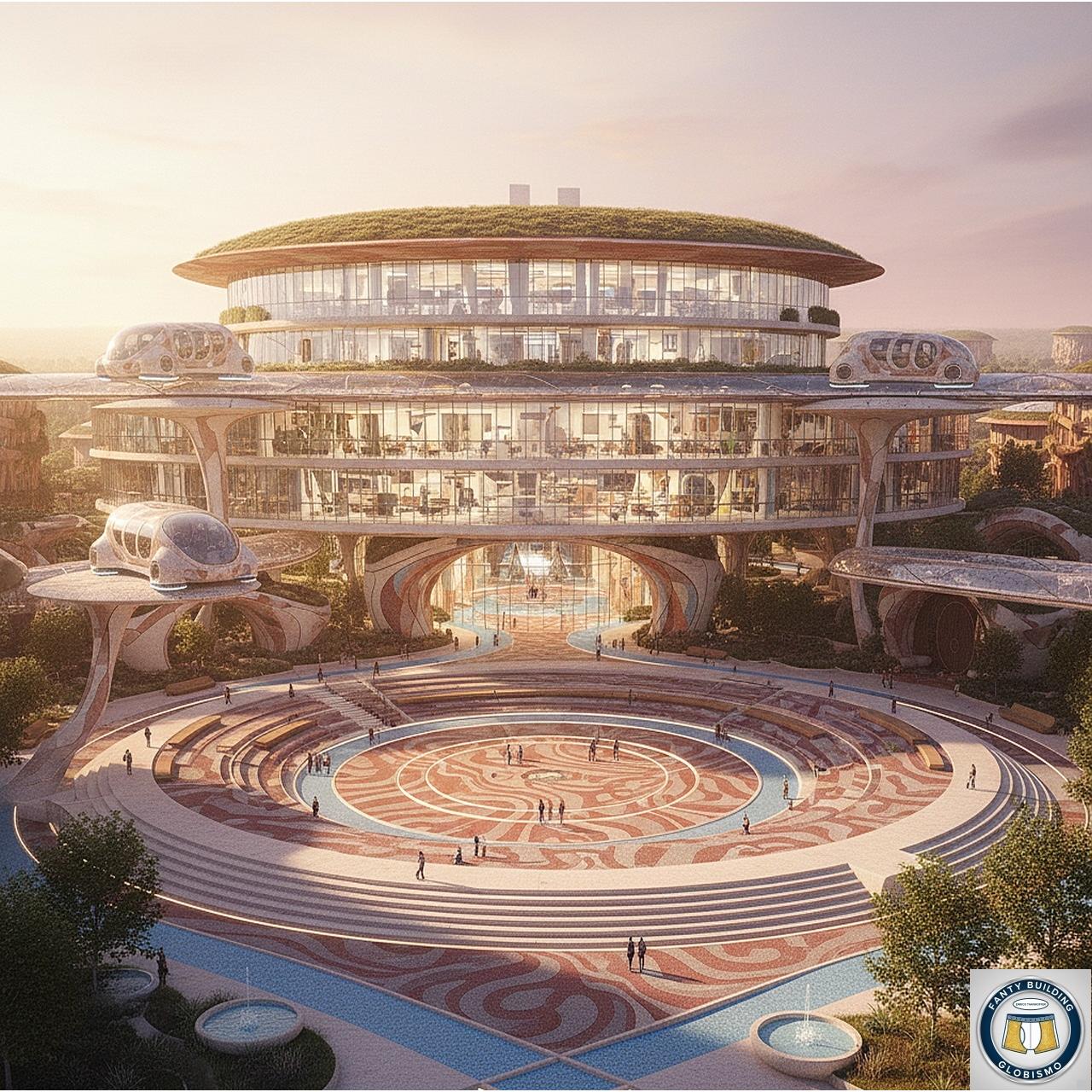 Geometria e Struttura: La scena è dominata dal cerchio e dalla sfera. Il fulcro è una grande piazza circolare (un'agorà moderna) con motivi pavimentali organici che richiamano correnti fluide o venature naturali. L'edificio si eleva con forme curve, evitando angoli retti, in linea con l'architettura biomorfica.