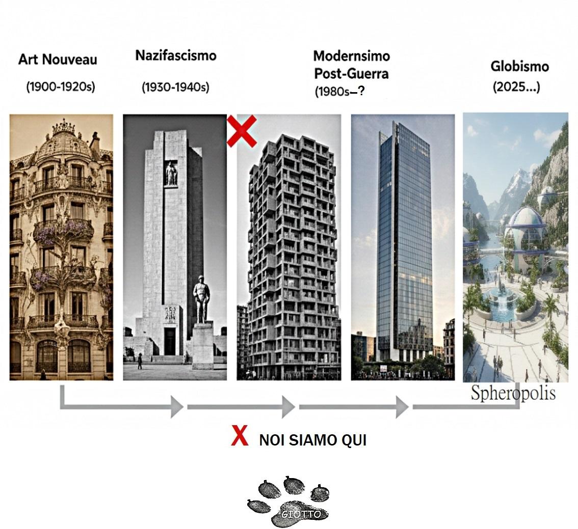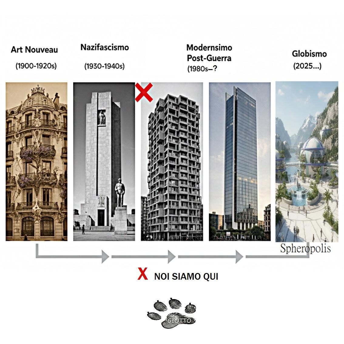 Se osserviamo l’ultimo secolo di storia urbana, appare chiaro che non ci siamo mossi lungo una linea retta, ma lungo un arco che sta finalmente per chiudersi. L’immagine che sta circolando negli studi di progettazione più all'avanguardia (vedi grafico) suggerisce una tesi affascinante: il 2025 segna l’inizio di una nuova era, il Globismo, che altro non è che la rinascita tecnologica di quell’impulso vitale che fu l’Art Nouveau.