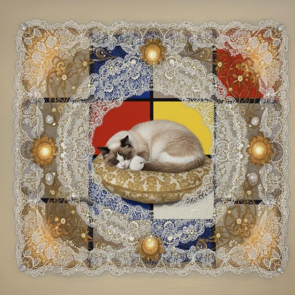 Intervento di Vestizione: Ogni linea nera di Mondrian deve essere coperta da un filo di pizzo dorato tridimensionale. La griglia deve diventare un ricamo.