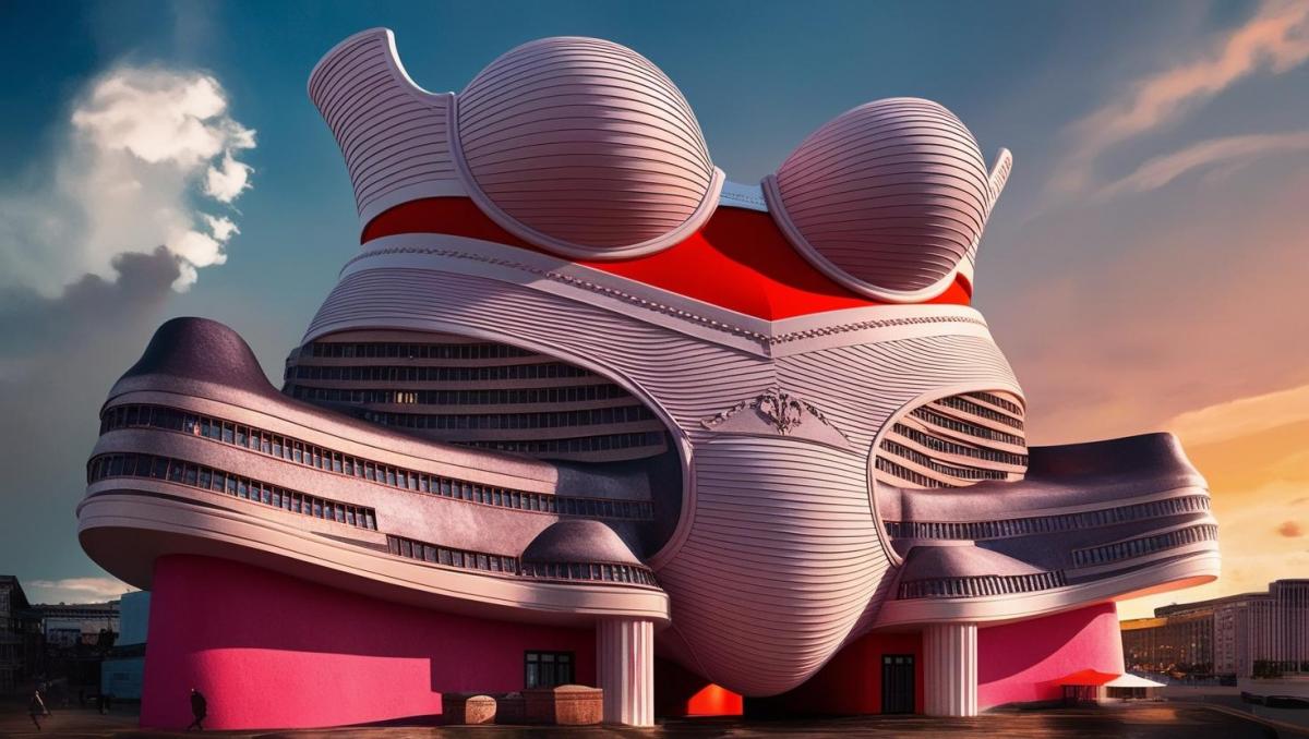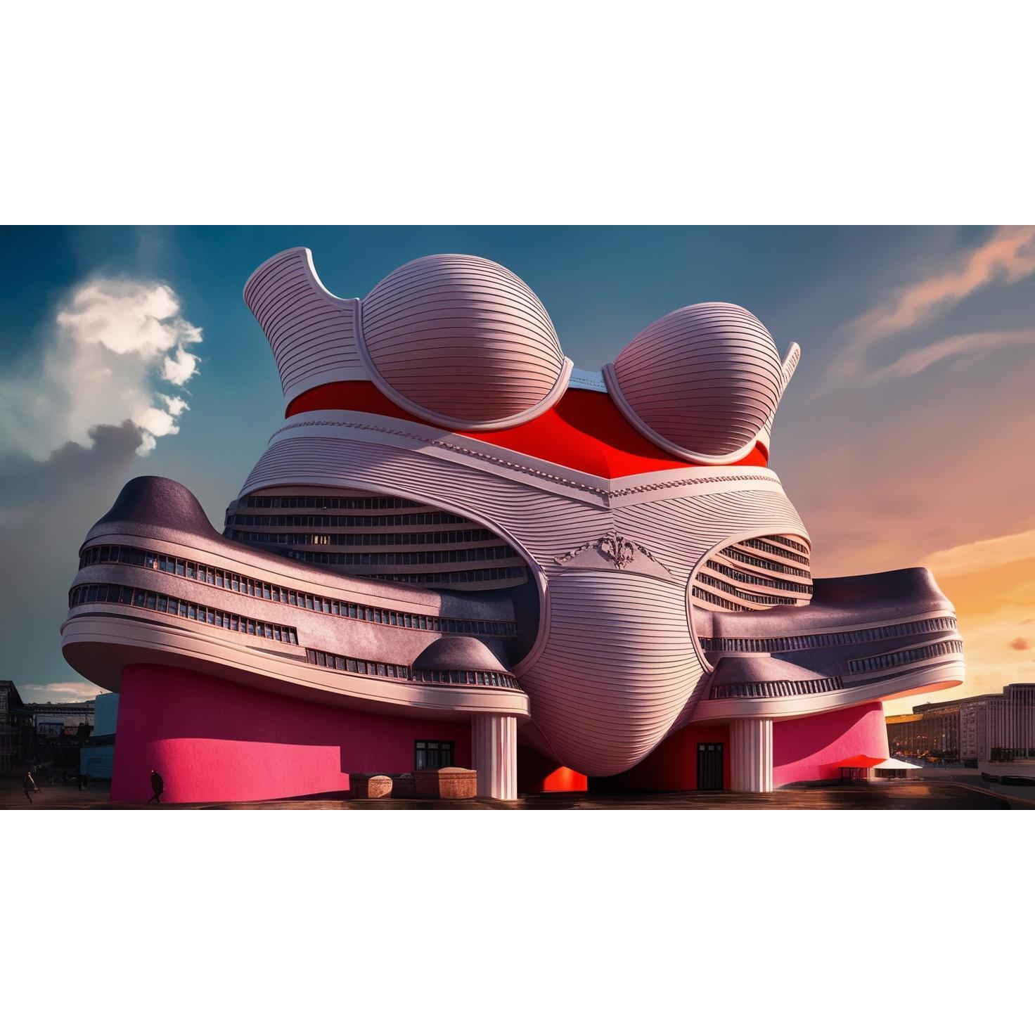 1. The Morphology of DesireIn this new creation, the artist moves beyond the scale of a small village to confront urban monumentality. The building is no longer a simple structure "dressed up," but a total fusion of human anatomy and engineering. The spherical forms of the architectural "brassiere" crowning the structure are not merely visual provocations; they represent residential domes that defy gravity, celebrating the curve as the only form capable of nurturing life.