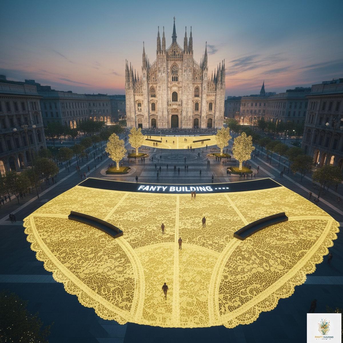 Milan never ceases to amaze, but this time the provocation emerges from below—quite literally—from the pavement of its most iconic square. Under the shadow of the Duomo’s spires, the artist Fanty Building has unveiled a digital installation that is already sparking intense debate among critics and passersby: a gigantic weave of golden lace tracing the silhouette of an intimate garment, spread like a royal carpet across the stones of Piazza Duomo.