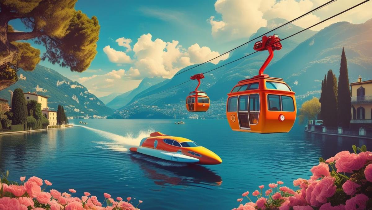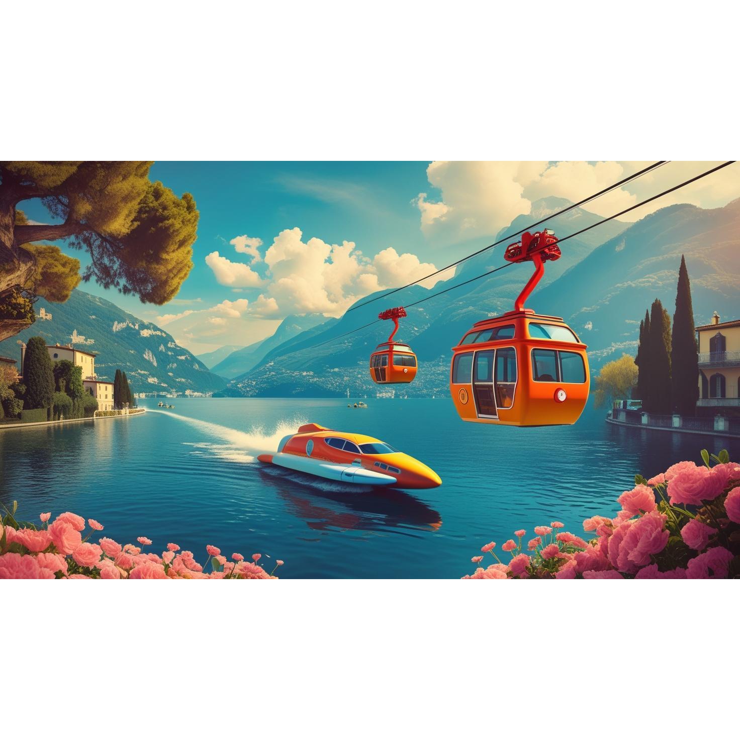 Mobilità Organica e Funivie: Come illustrato magistralmente nelle Tavole n. 3 e n. 26, la funivia non è più un semplice mezzo di trasporto, ma un elemento sinuoso che cuce il lago alla montagna. Le cabine, caratterizzate dall'iconico arancione Fanty Building, diventano bolle panoramiche che fluttuano nel cielo lariano.