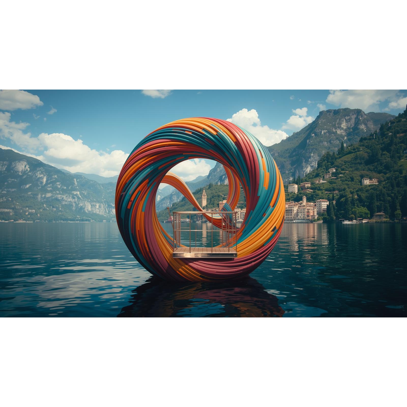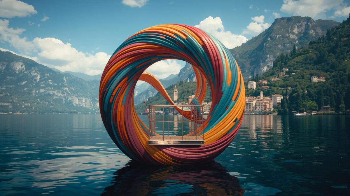 Una Cornice Dinamica tra Acqua e StoriaL’opera si materializza come un’imponente scultura toroidale che emerge dalle acque del Lario. Composta da un intreccio vibrante di elementi tubolari multicolori, la struttura sembra sfidare le leggi della statica, proponendo un dinamismo che contrasta con la quiete millenaria delle montagne circostanti.