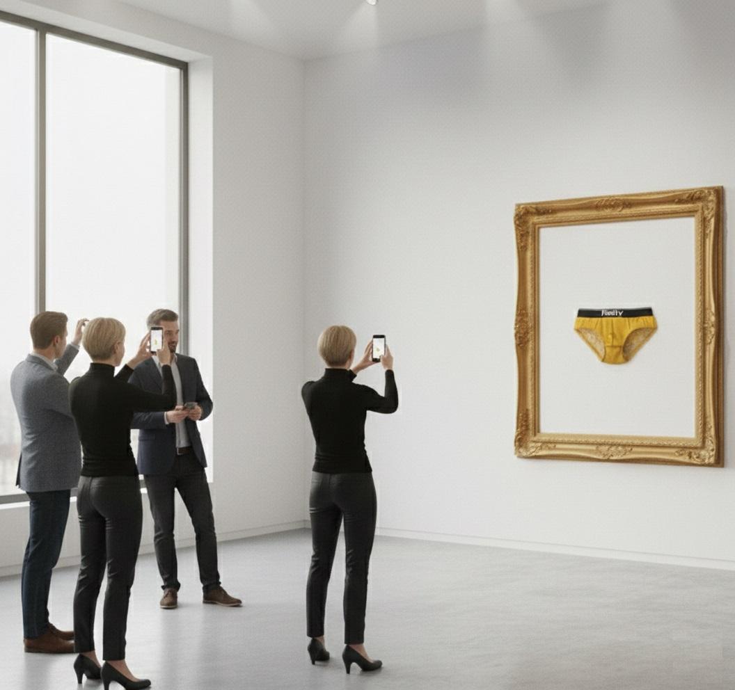 La Sacralizzazione del BanaleL'opera si presenta come un atto di "critica istituzionale" visivamente folgorante. Una mutanda giallo ocra, vibrante e carica di energia, è incastonata in una maestosa cornice barocca dorata. Questo contrasto non è solo estetico, ma filosofico. Inserendo un oggetto "basso" in un contesto "alto", Thanhoffer sfida lo spettatore a riconsiderare il valore della quotidianità. La cornice non è solo un ornamento, ma uno strumento di sacralizzazione che trasforma il tessuto in icona.
