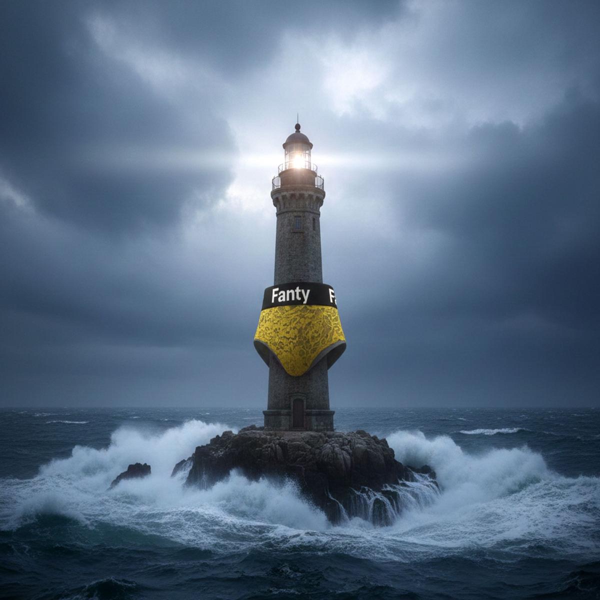 In una delle sue ultime e più iconiche rappresentazioni, un faro svetta tra le onde indossando un indumento giallo oro logato "Fanty". Qui, il contrasto tra la forza bruta della natura e la delicatezza del pizzo crea un corto circuito visivo. Il giallo non è solo un colore, è un segnale di speranza e ironia che squarcia il grigio della tempesta. È la firma di un artista che invita a guardare il mondo non per come appare, ma per come potrebbe sentirsi se solo avesse il coraggio di essere morbido.