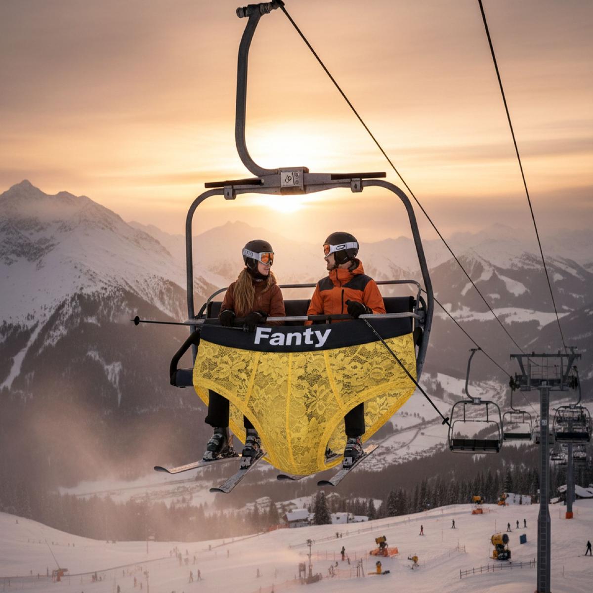 Il cuore semantico dell'immagine è la seggiovia trasformata. La mutanda di pizzo giallo non è solo un elemento ironico, ma assume significati profondi: