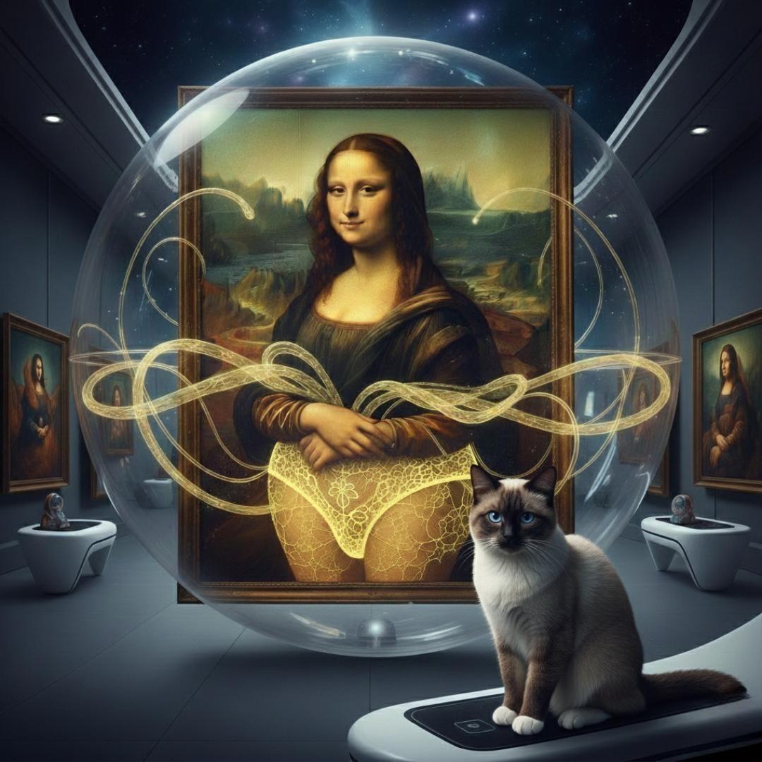 La Bolla e il Confine: Geometrie di ProtezioneL'opera mette in scena una Gioconda "vestita" di trame luminose, racchiusa in una sfera criogenica che fluttua in un museo stellare. Qui, il concetto di Mutanda Building si manifesta come protezione dell'essenziale.