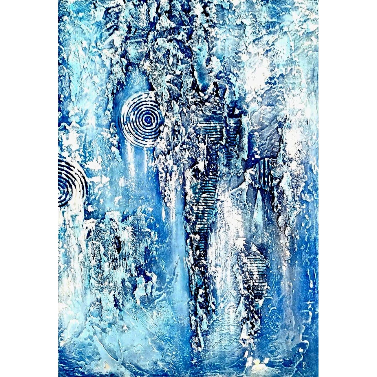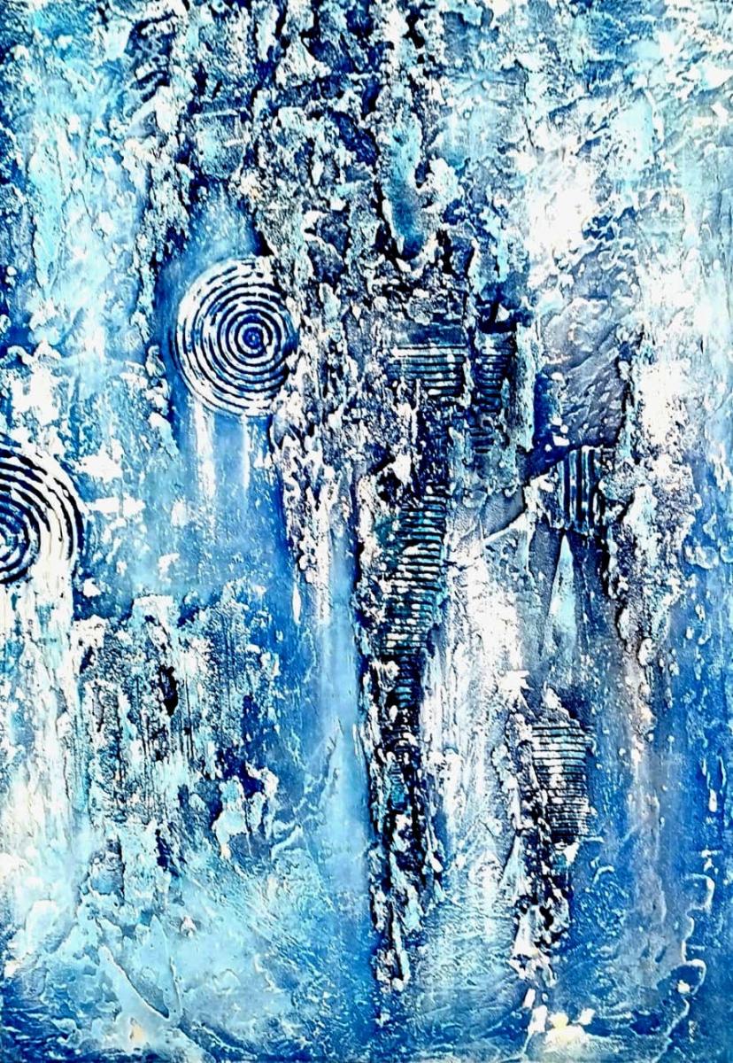 Le texture creano fratture, rilievi e stratificazioni che richiamano il gelo antico, capace di fermare il tempo e di avvolgere tutto in un silenzio assoluto. I toni freddi, profondi evocano un mondo sospeso, dove la materia sembra respirare lentamente sotto la coltre di ghiaccio.