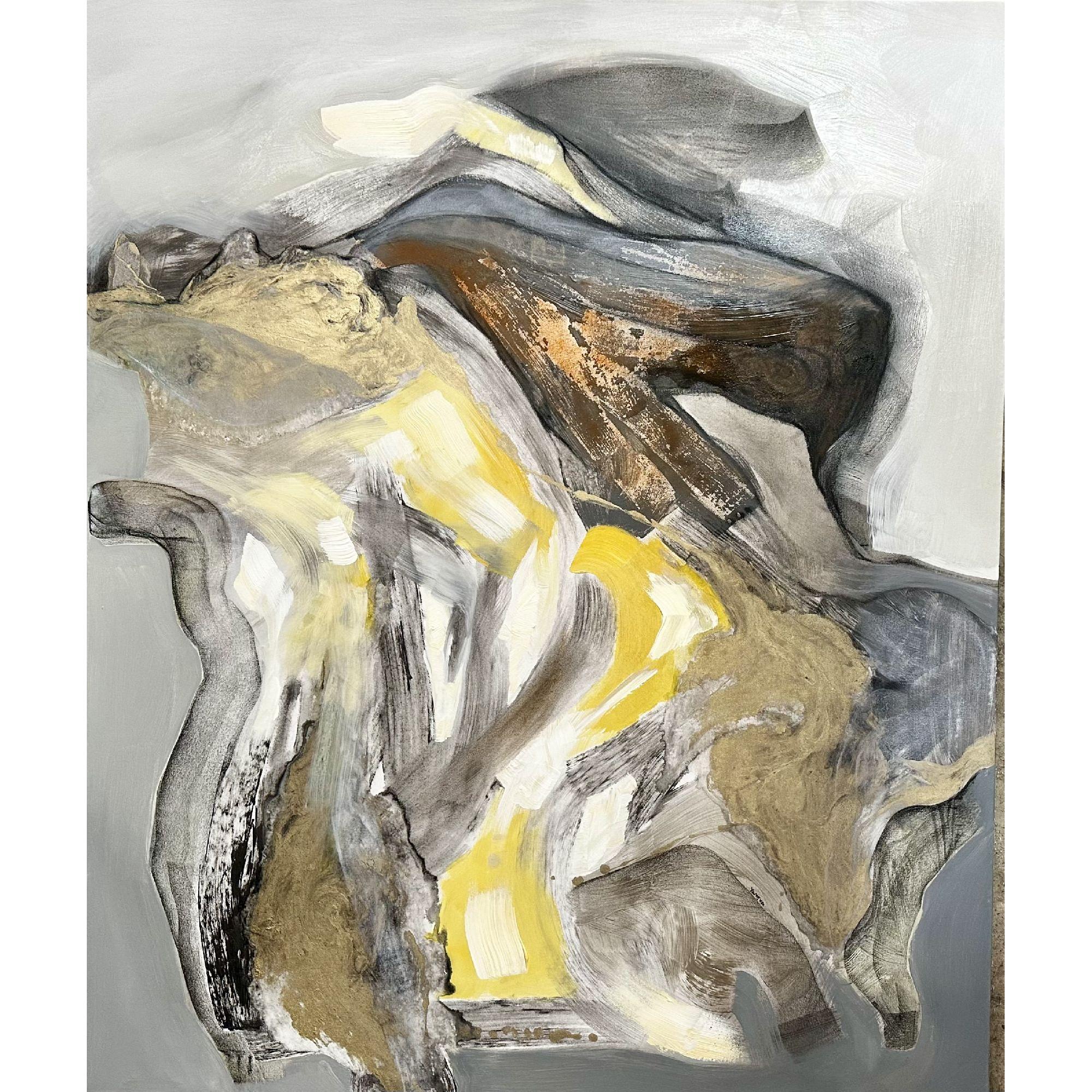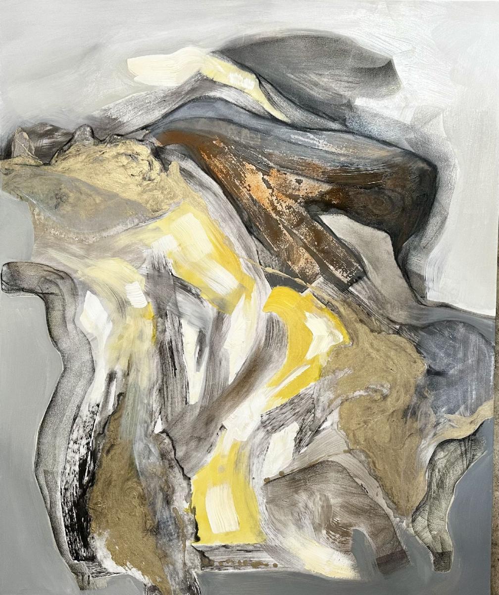 L'immagine mostra un'opera d'arte astratta caratterizzata da una varietà di texture e colori. Predominano tonalità di grigio, bianco, giallo e marrone, con alcune sezioni che sembrano avere una consistenza stratificata o ruvida. Le forme non sono definite, creando un effetto organico e fluido che suggerisce movimento. L'uso dei colori e delle texture dà un senso di profondità e tridimensionalità all'opera.