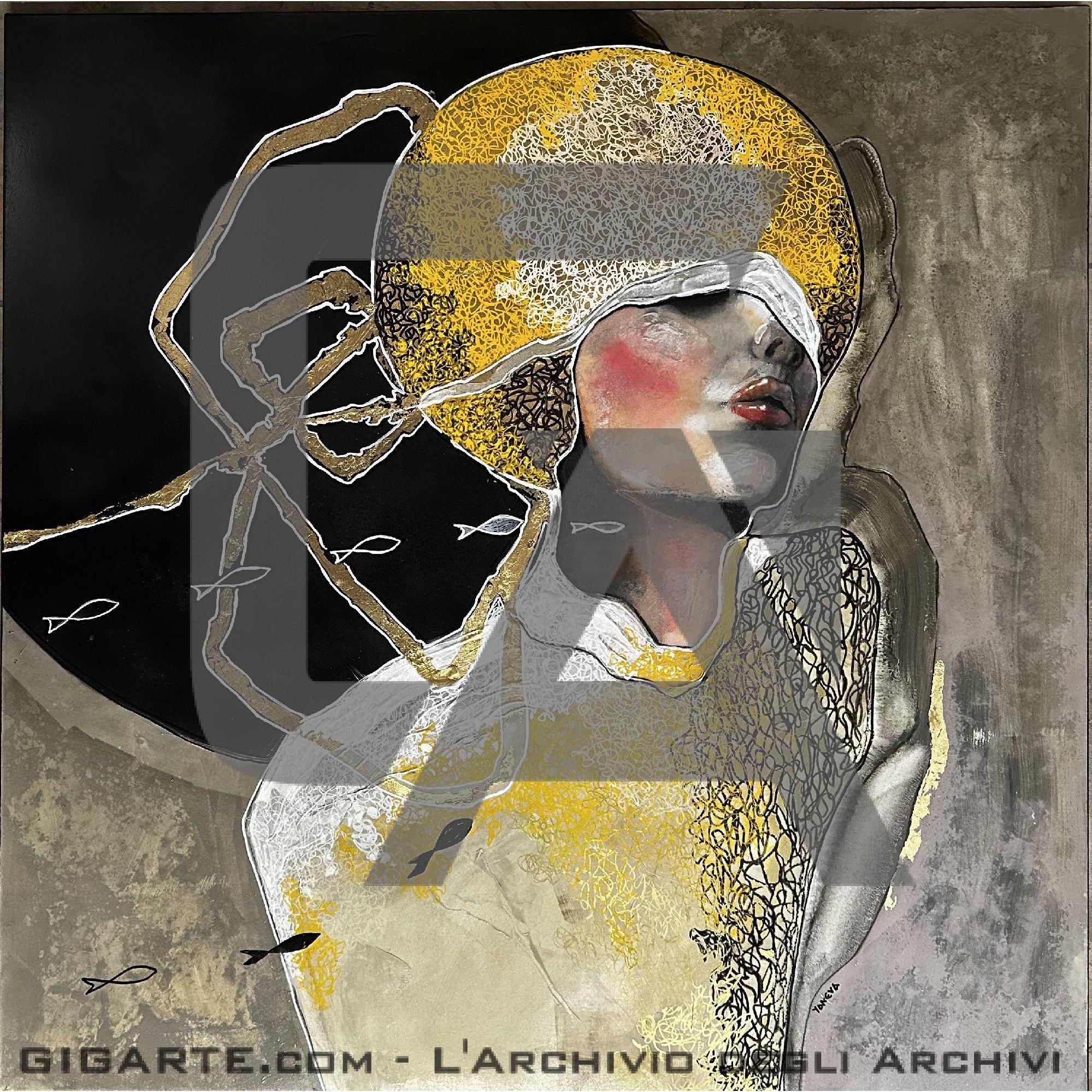 Quest'opera d'arte presenta un'immagine stilizzata di un volto umano, con tratti delicati e un'espressione enigmatica. Il soggetto è rappresentato con una grande aureola dorata che ricorda il sole o un'aureola mistica, creando un forte contrasto con lo sfondo scuro. Linee astratte e sinuose circondano la figura, arricchendo la composizione con un senso di movimento. Piccoli pesci neri fluttuano intorno al soggetto, aggiungendo un elemento di natura e simbolismo. I colori dominanti sono oro, nero e bianco, con tocchi di rosso sulle guance del soggetto, conferendo all'opera un senso di calore e intimità.