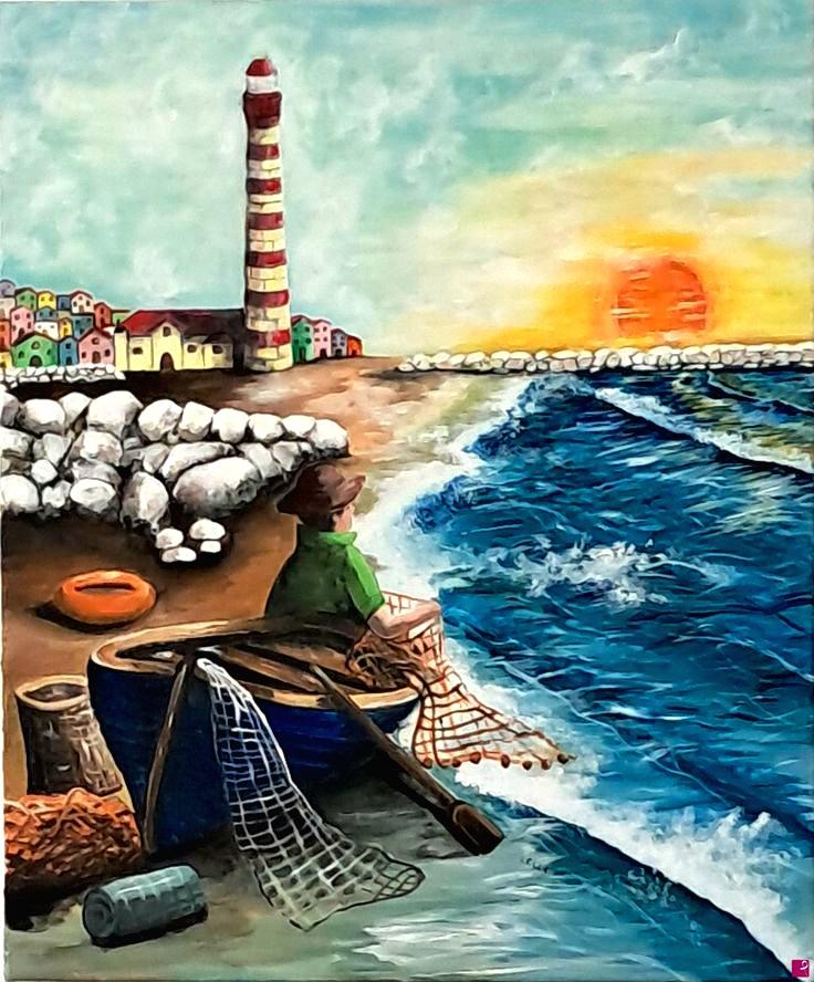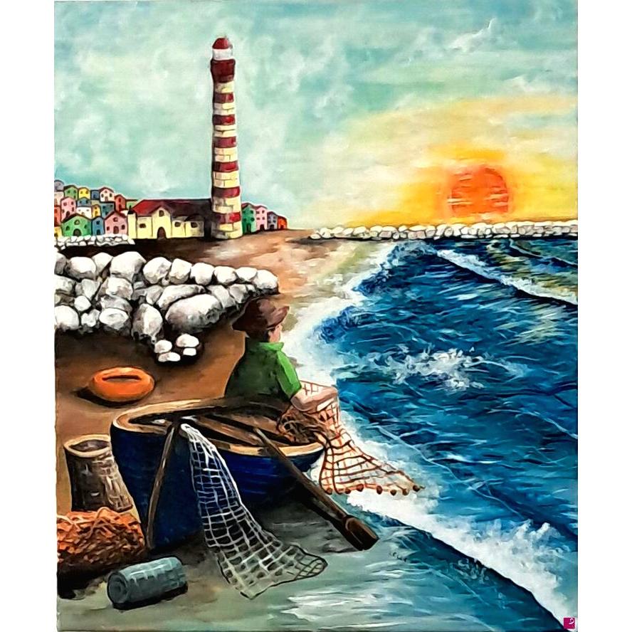 Un pescatore siede assorto ascoltando il canto lento delle onde che sfiorano la riva .Il farò veglia alle sue spalle , mentre il sole tinge il cielo di luce calda e sfumata . Le reti le bare le case colorate raccontano una vita semplice...fatta di attese