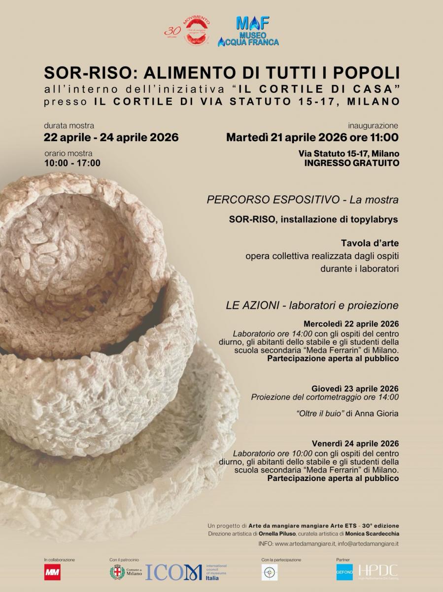 Nel cortile-giardino di Via Statuto 15-17, durante la Milano Design Week 2026, prende forma SOR– RISO: alimento di tutti i popoli, progetto partecipato ideato da Arte da mangiare mangiare Arte ETS. Un’installazione collettiva che trasforma il riso in materia artistica e il giardino in spazio di incontro: sul cibo come linguaggio universale, sul sorriso come gesto di condivisione, sulla convivialita? come atto politico e culturale.