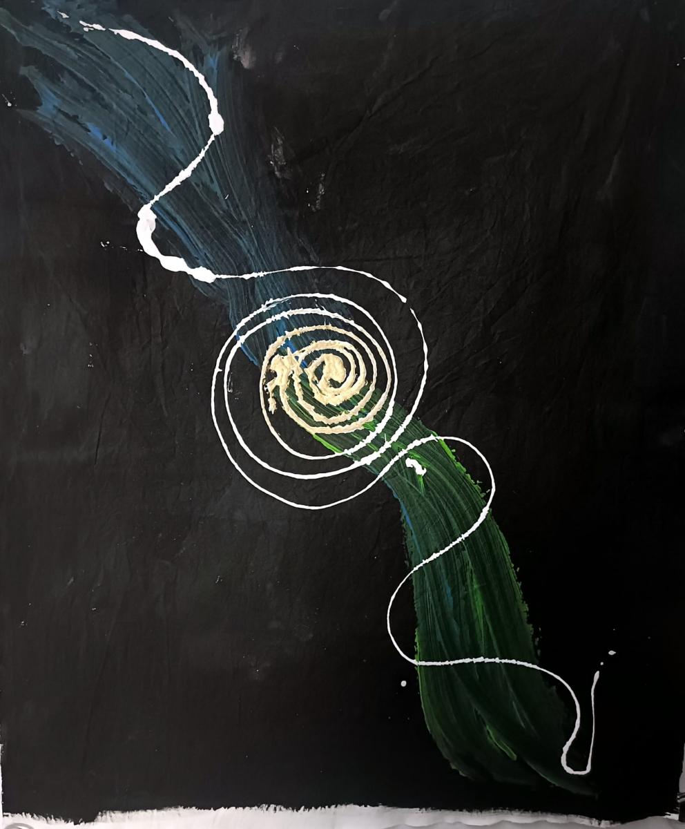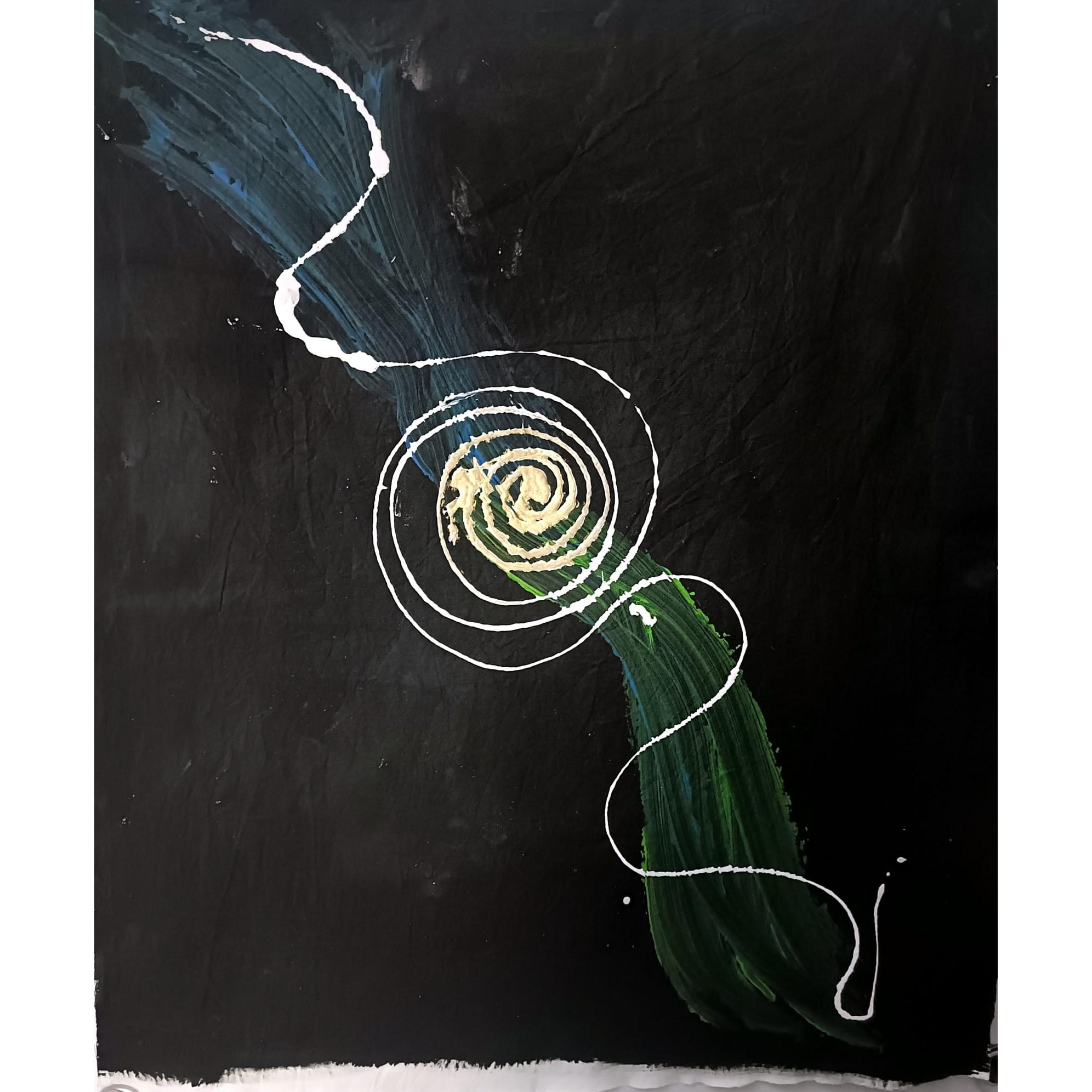 Su un fondo nero profondo, una linea bianca traccia una spirale che non si dissolve mai. Il gesto si avvolge verso un nucleo dorato da cui l'intera composizione irradia, per poi proseguire verso il basso in una massa verde scura che assorbe e radica il movimento. In alto a sinistra, un tocco di blu scende come un respiro trattenuto. ????? — l'eccellenza come fedeltà alla propria natura — non è uno stato fisso ma un orientamento continuo: la spirale resta aperta, ancora in movimento, ancora fedele.
