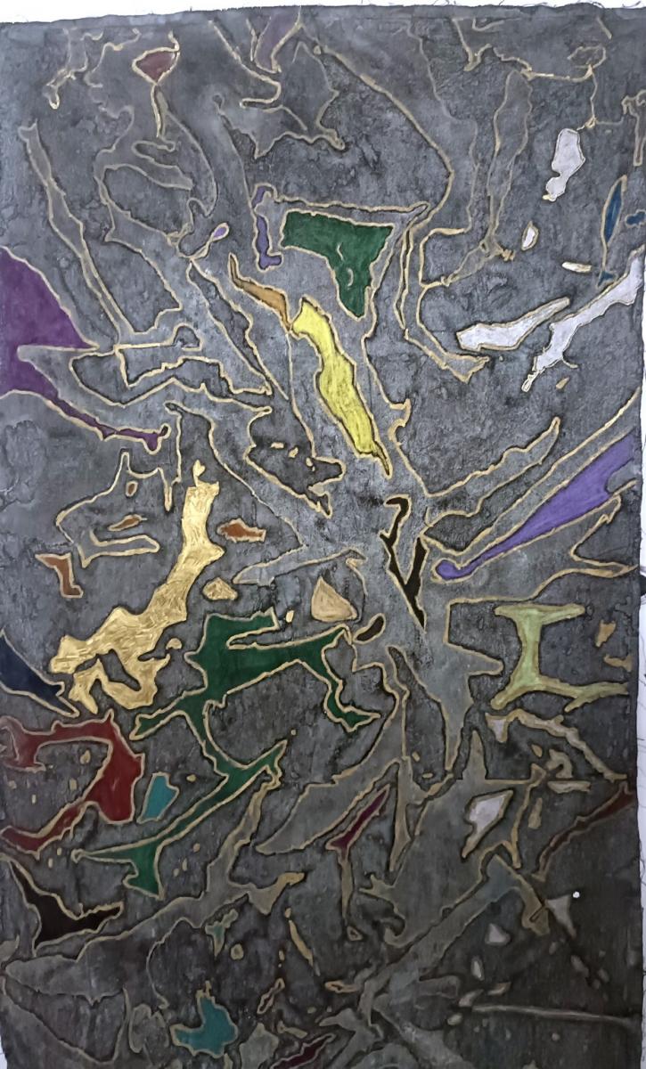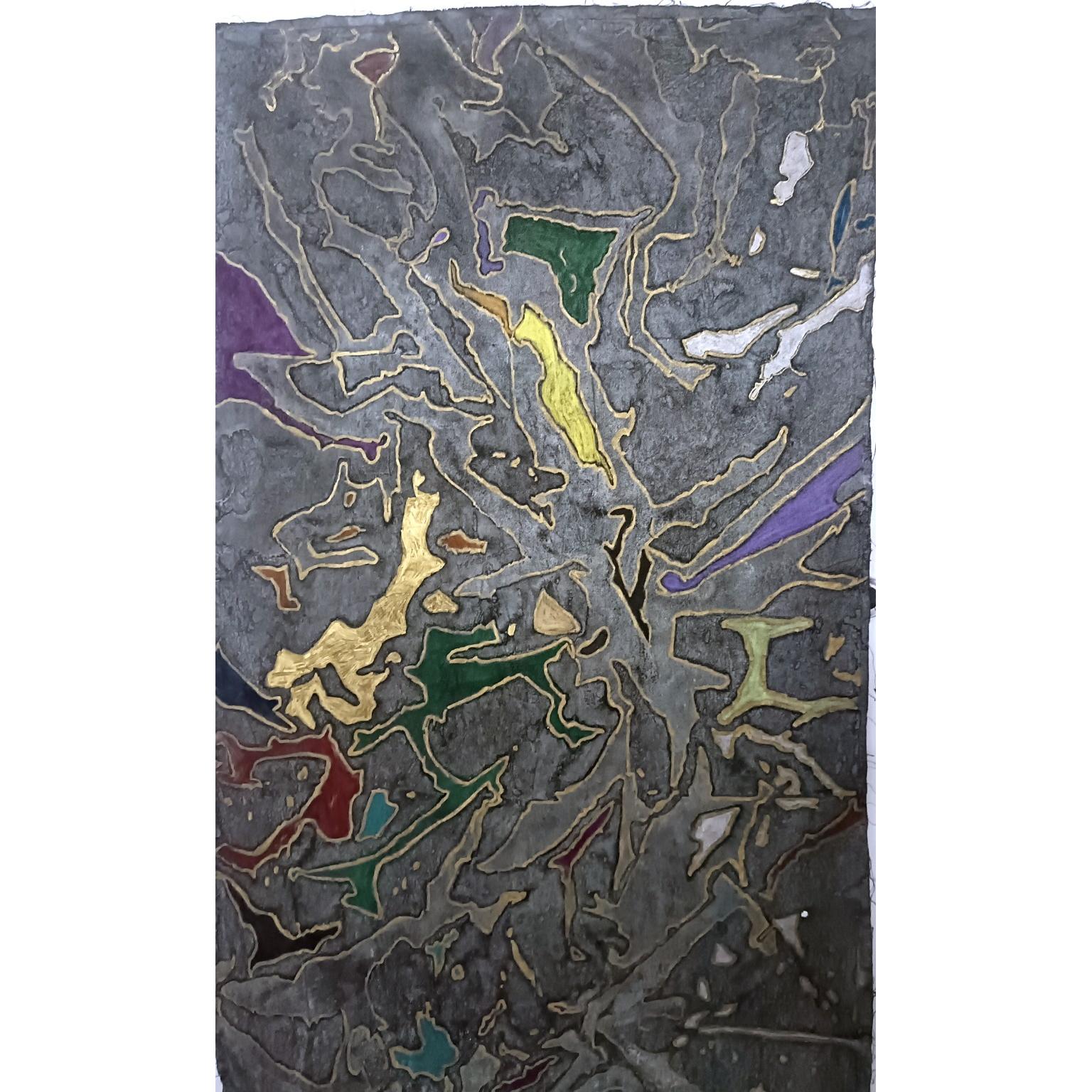 L'opera nasce da un errore tecnico: mentre applicava un fondo nero su una superficie plastica, il pigmento si è depositato e ritirato sul rovescio della tela, generando una configurazione imprevista di fratture, flussi e accumuli. Le linee dorate non impongono ordine ma riconoscono ciò che è accaduto — agiscono come confini provvisori, simili a suture che rendono visibile la rottura invece di nasconderla. Il rovescio diventa il fronte: un luogo di rivelazione piuttosto che di residuo. L'opera rifiuta la rappresentazione in favore dell'emersione — la pittura come traccia di un evento già iscritto nella materia.