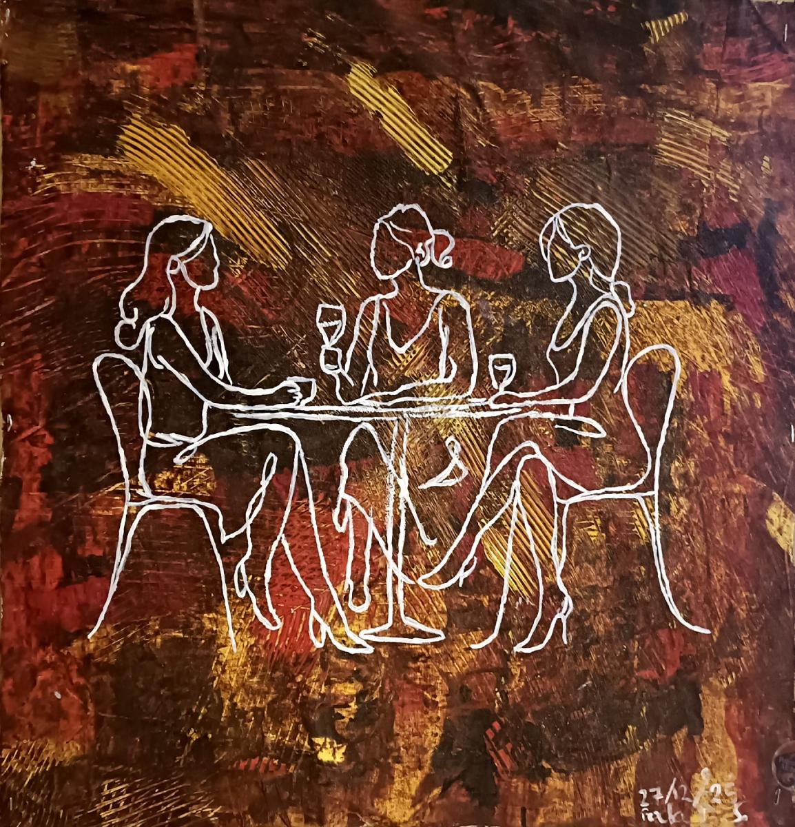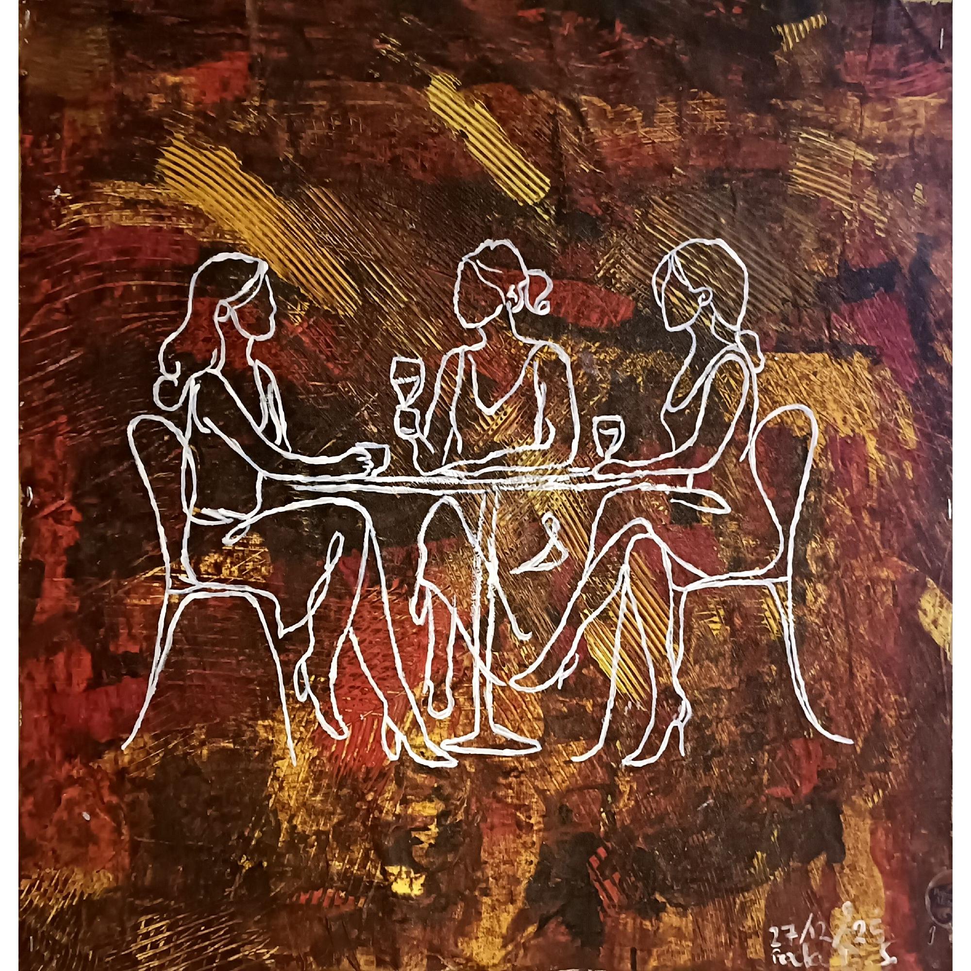 Tre figure ridotte a linea essenziale siedono attorno a un tavolo in un gesto ordinario e universale: bere insieme. Non c'è dialogo esplicito né sviluppo narrativo — ciò che emerge è la presenza. La linea bianca continua non definisce l'identità individuale ma la relazione. I corpi non si impongono sullo spazio: lo abitano con leggerezza, come sorretti da una forza che si oppone al peso. Lo sfondo texturizzato attraversato da toni caldi terrosi non è una semplice superficie ma un campo emotivo che accoglie e sostiene. La calma non è assenza di tensione, ma un raro equilibrio in cui il peso dell'esistenza è temporaneamente sospeso.