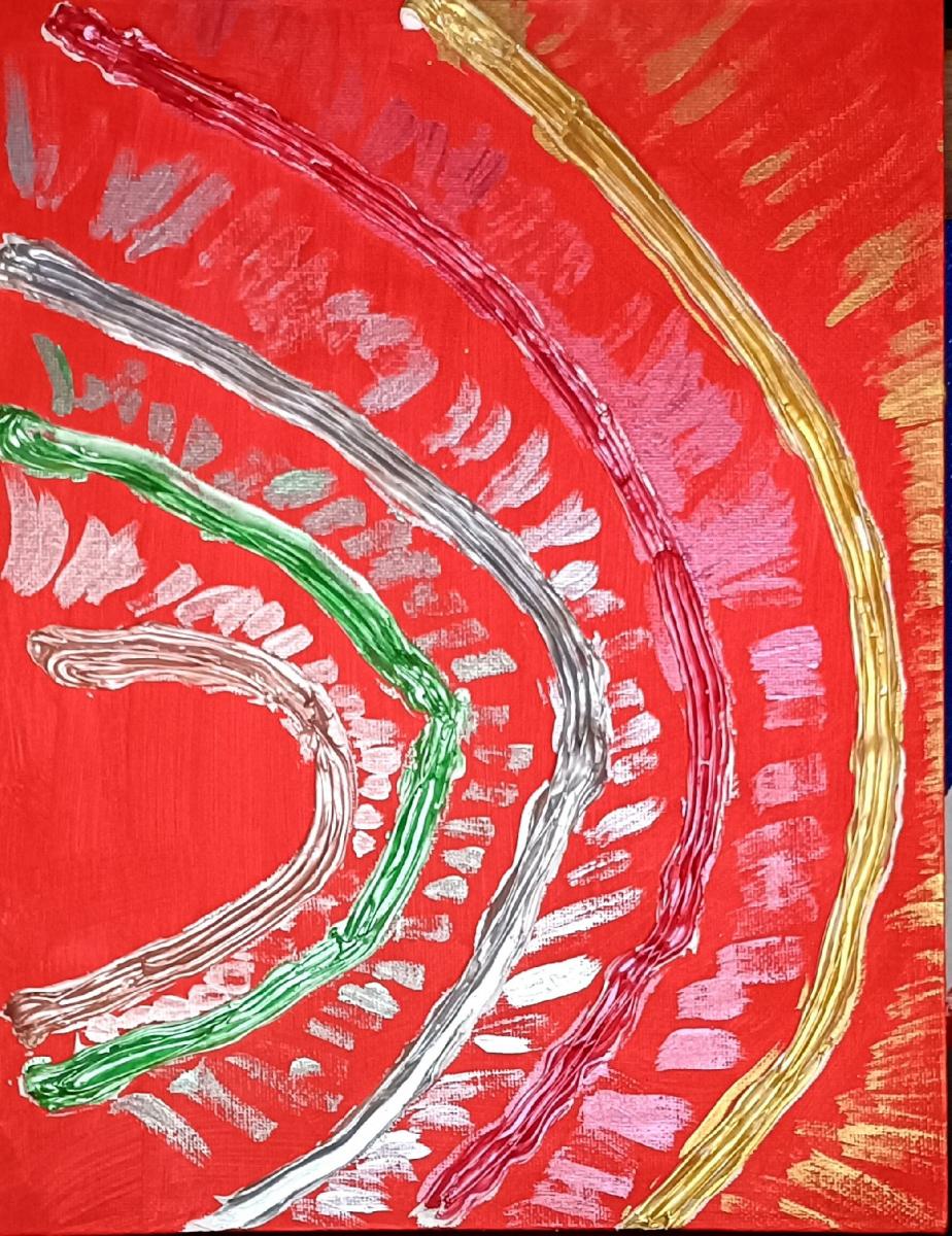 Le traiettorie avanzano senza collisione, mantenendo una distanza che non è separazione ma relazione. Ogni gesto segue il proprio percorso contribuendo a un campo dinamico condiviso in cui l'equilibrio nasce dalla coesistenza piuttosto che dalla simmetria. Il campo rosso non funziona come semplice sfondo ma come presenza attiva — un suolo vitale che sostiene la tensione cromatica e conserva la memoria del gesto. La densità materica introdotta dal gesso esalta la fisicità della superficie, rendendo visibile la dimensione temporale della pittura come processo. Il movimento non cerca risoluzione ma continuità.