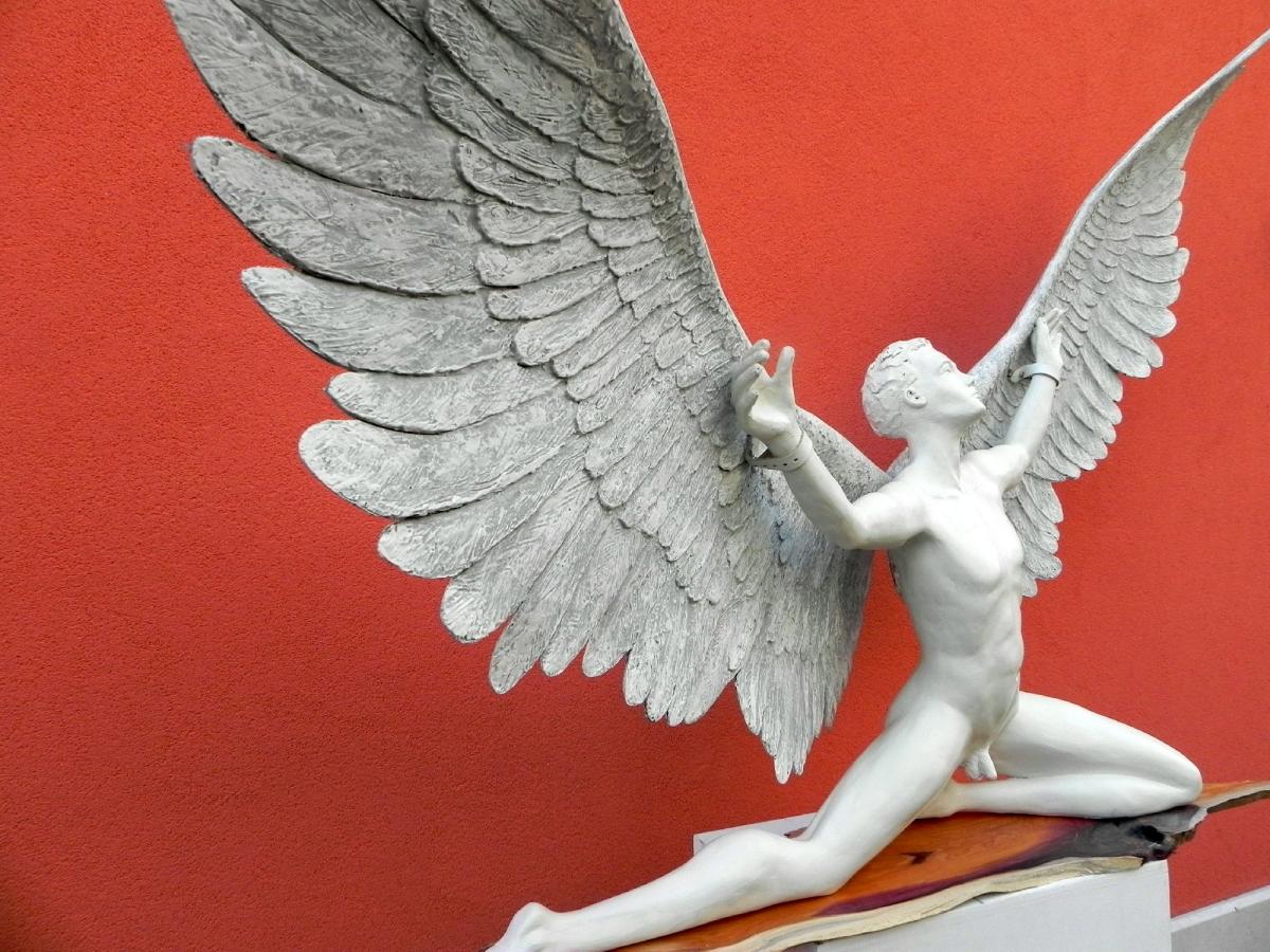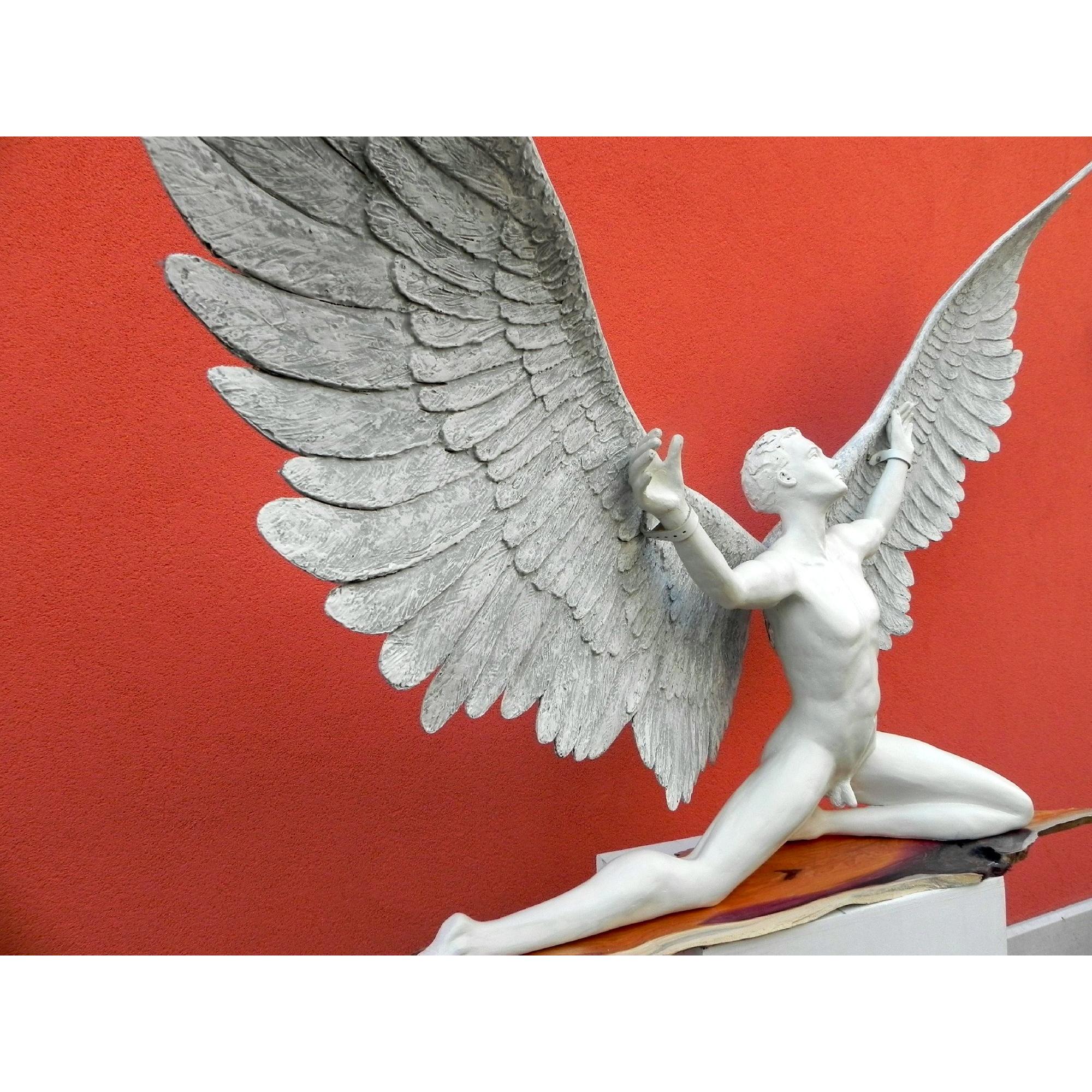 Realizzazione mista. Icaro é realizzato in argilla cotta. Le ali, per esigenze strutturali sono costruite in fibra di vetro e resina poliestere. Questa soluzione dettata dal poco peso della fibra di vetro essendo le ali sospese . In argilla avrebbero pregiudicato la rottura delle braccia.