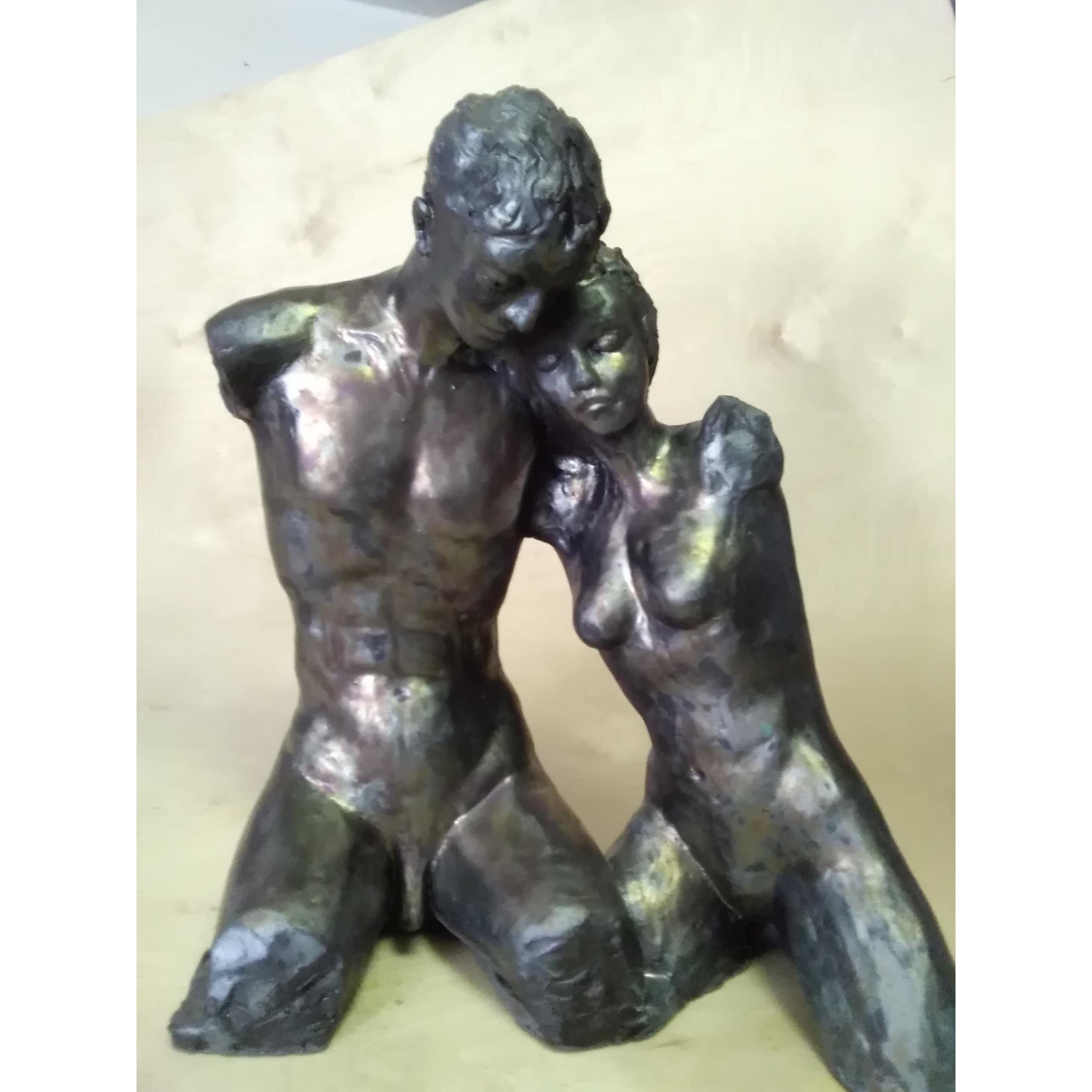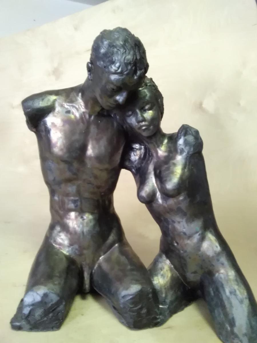 Opera in argilla ceramica che rappresenta il desiderio di coccole tra due innamorati. Colorato per la seconda cottura a 1200 gradi, con pigmenti a base di polimeri particolari che le conferiscono un'immagine quasi metallica.