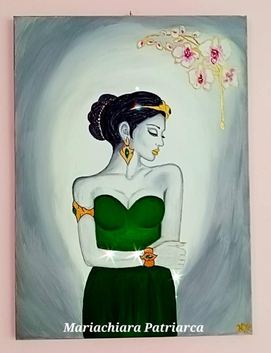 ??Essenza preziosa?? 55x75 acrilico e foglia d'oro su tela. In un mondo dove l'eleganza e raffinatezza sembra ormai dimenticata. Come un fiore in un deserto arrido , nasce" Essenza Preziosa ".Attraverso il contrasto del bianco e nero, la profondità vibrante del verde smeraldo cristallizza ogni istante di pura eleganza. La figura femminile raccolta in una posa di composta introspezione, incarna una raffinatezza delicata come la purezza di un'orchidea. Questo quadro è un omaggio alla delicatezza e all'eleganza femminile. È un invito a riscoprire la bellezza nella semplicità dei gesti e nella nobiltà che si riflette in uno sguardo. I gioielli in foglia d'oro non sono semplice ornamenti ma simboli di una luce interiore rappresentano la preziosità dell'anima e ogni dettaglio è un omaggio alla nobiltà e raffinatezza in una bellezza senza tempo dove l' arte si trasforma in poesia.?? Mariachiara Patriarca?? ??Fantasy Artist ??