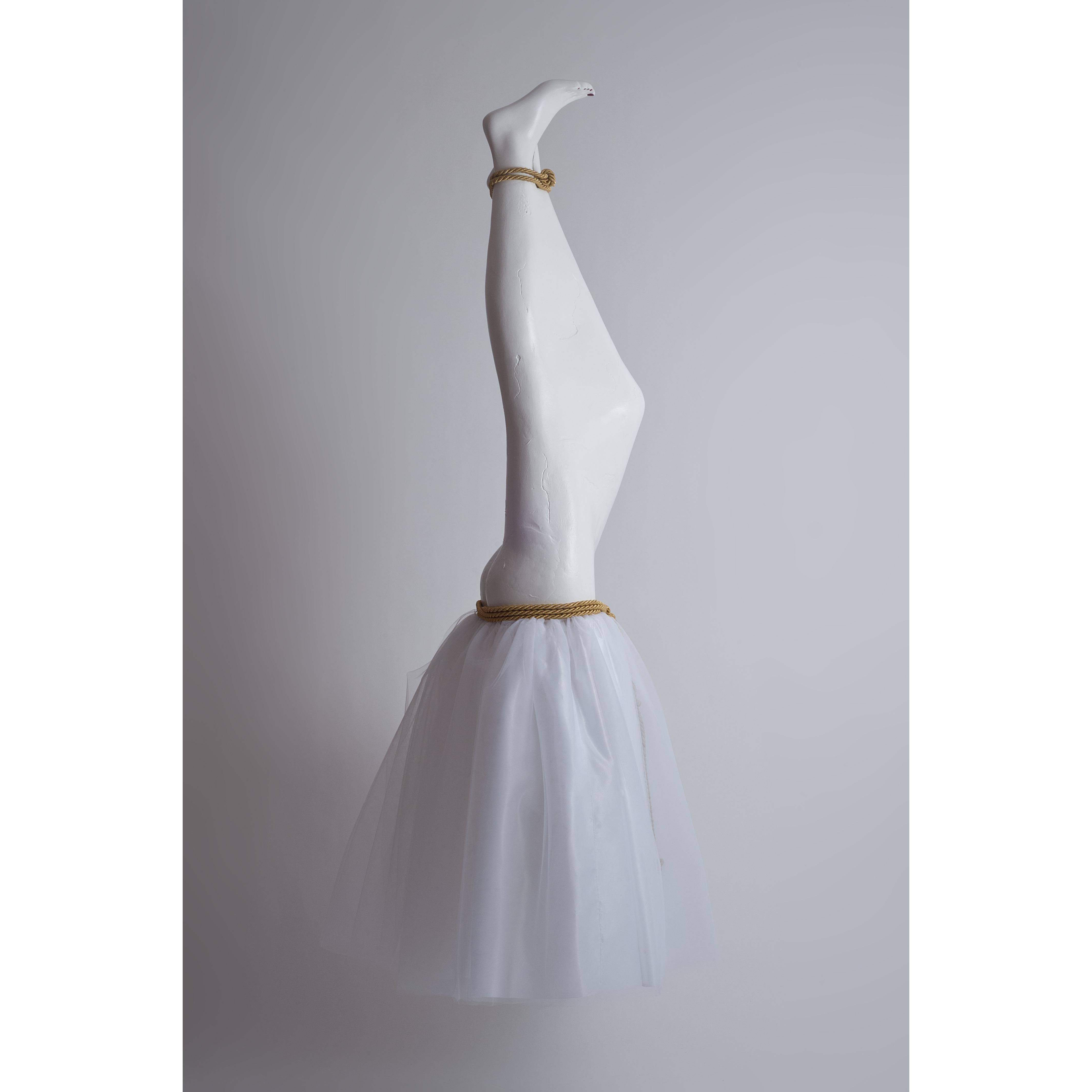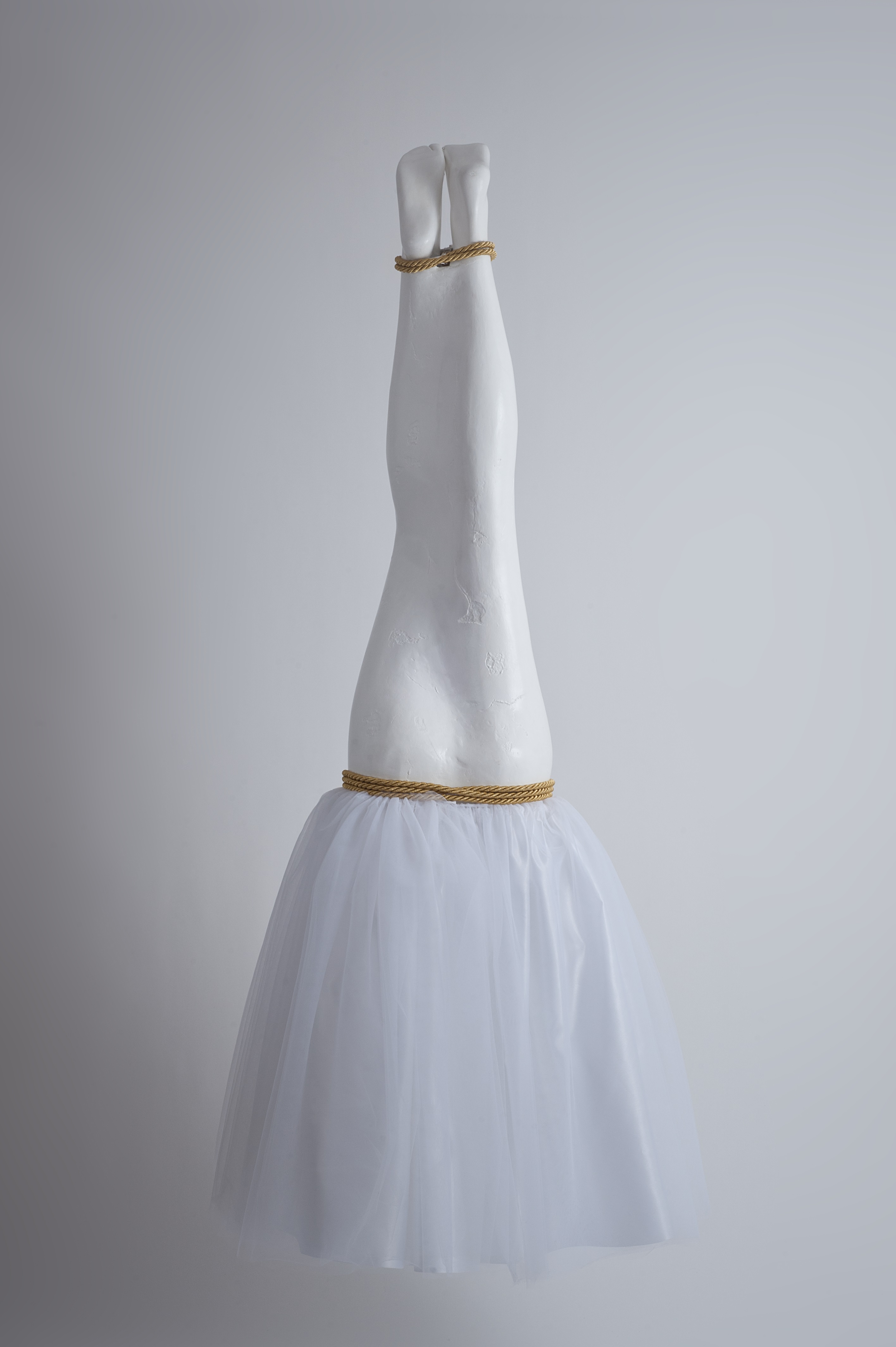 La Gravità, si definisce come "Causa capace di modificare lo stato di riposo o movimento di un corpo" e in questa opera allo stesso tempo, presenta una dura realtà: la Gravità del fatto che tante donne siano maltrattate nel mondo intero, un fatto capace di cambiare lo stato del corpo di una donna, cambiare il suo mondo di ordine, mettere il suo universo "sottosopra". Tuttavia, come la maggior parte delle mie opere, vestite di bianco e con i piccoli dettagli "belli" come la gonna, il colore oro della corda e lo smalto, mette in evidenza la forza della trasmutazione e sublimazione spirituale dolore in un intervallo tra il bello e il brutto (brutale). È ironico come le donne che sono state aggredite siano considerate deboli, quando per vivere con il mondo sottosopra ci vuole forza per sopportare l'abuso, il dolore e la paura.