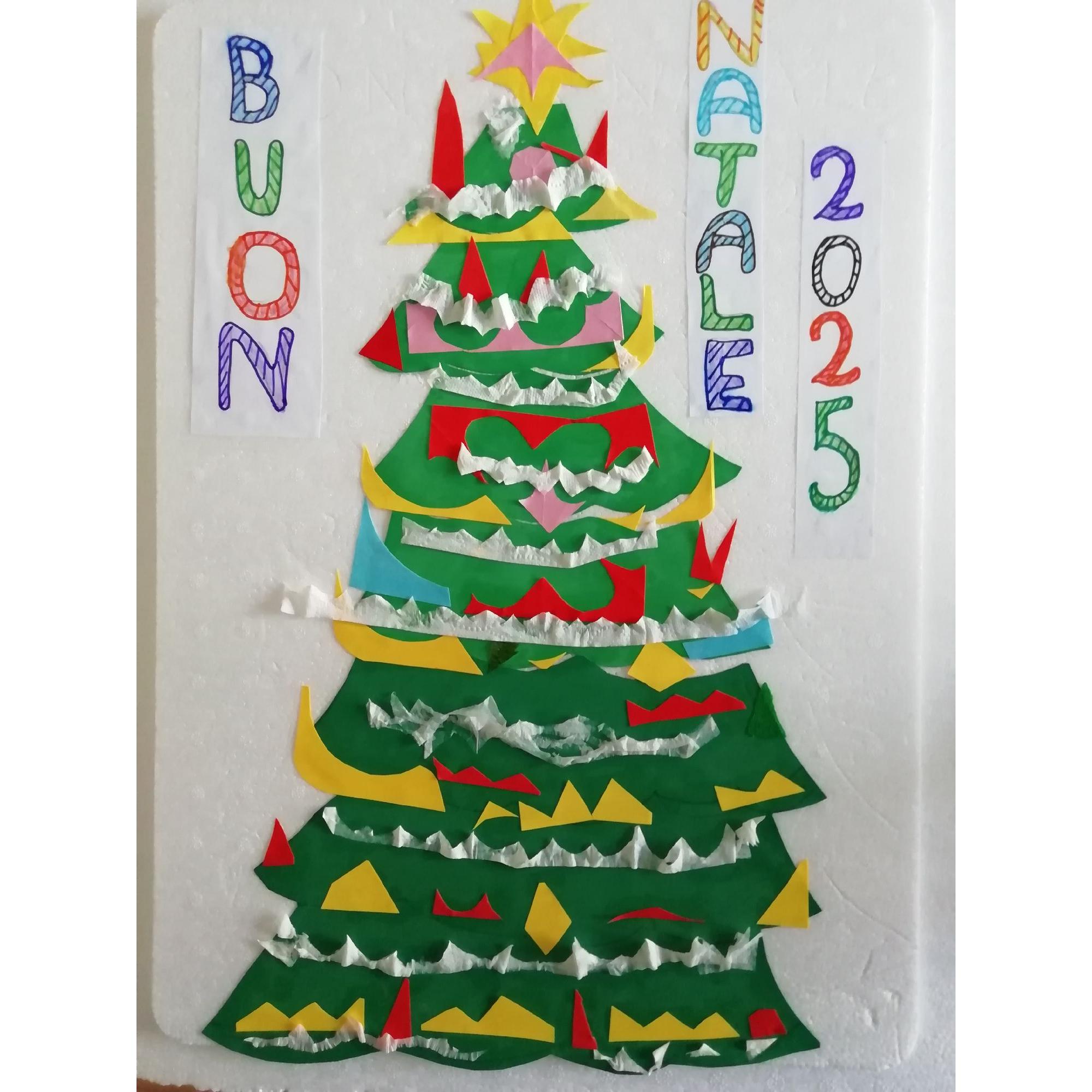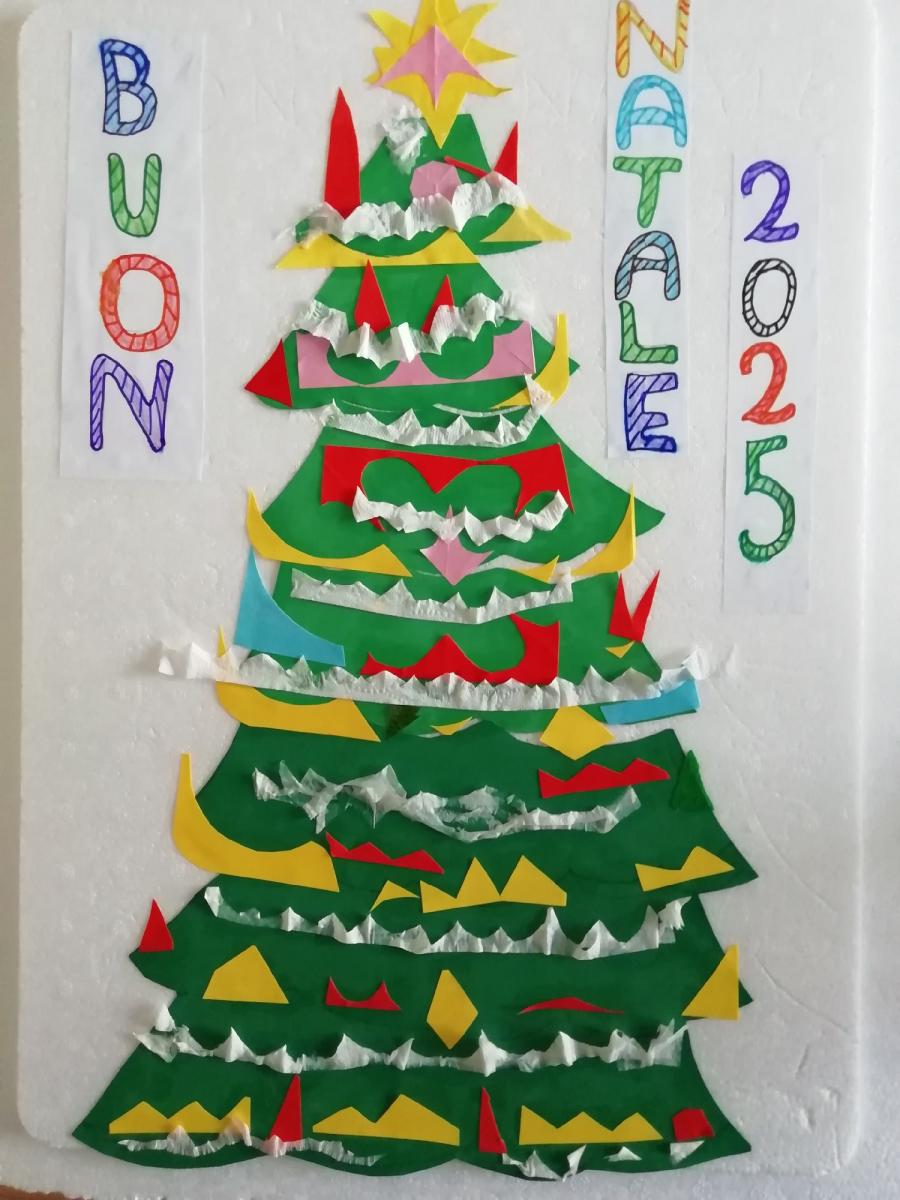 L'albero di Natale é arricchito con pezzi di cartoncino colorato per addobbarlo come se fosse vero.