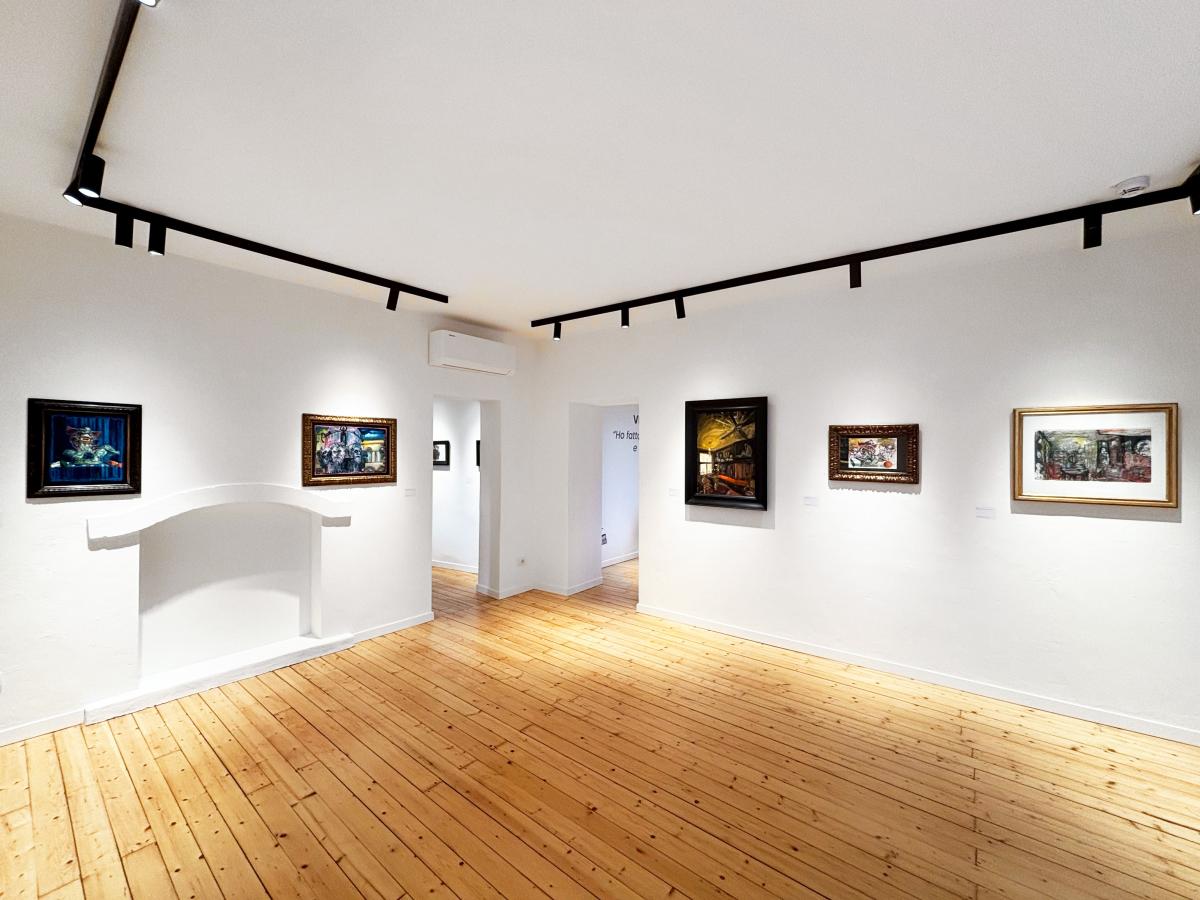 Tuttavia, l’architettura non è l’unico soggetto d’indagine nel lavoro di Gregolin. L’artista rivolge la sua attenzione anche allo spazio domestico e agli oggetti che lo abitano, trasportando il macrocosmo architettonico in un microcosmo intimo e narrativo: il ciclo di dipinti dedicati al Vittoriale degli Italiani, dal 2007 al 2025, sono un esempio preciso. Le sue opere si configurano come viaggi immersivi, pensati su misura per ciascun osservatore: i lampadari sospesi, i quadri appesi alle pareti, le reliquie orientali — come il qilin, simbolo di buon auspicio — accanto ai camini, sono tutti elementi che concorrono alla costruzione di un allestimento pittorico carico di significato. In questo contesto, Gregolin non è solo un pittore che racconta storie attraverso immagini, ma si pone anche come progettista dello spazio, traducendo emozioni in configurazioni visive.