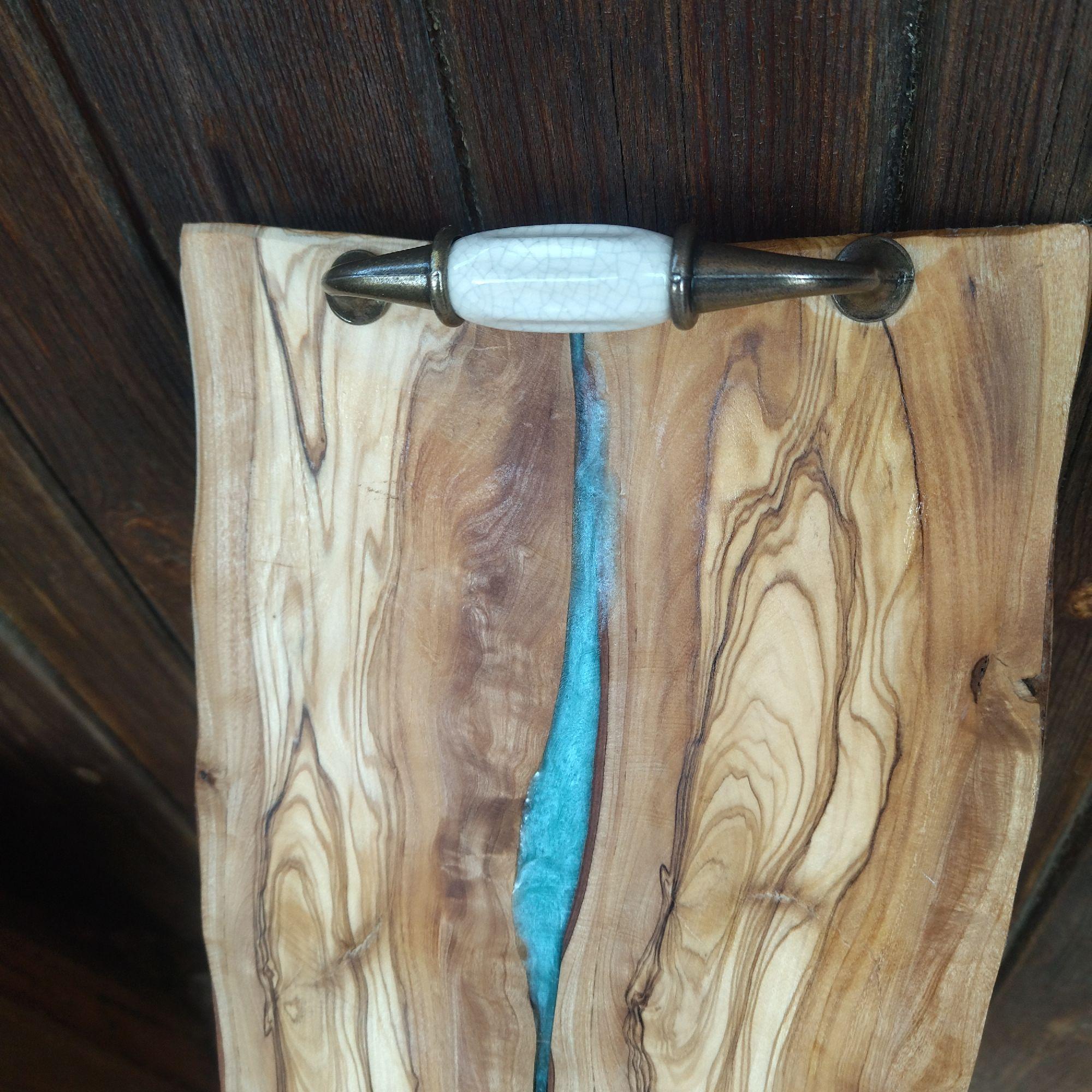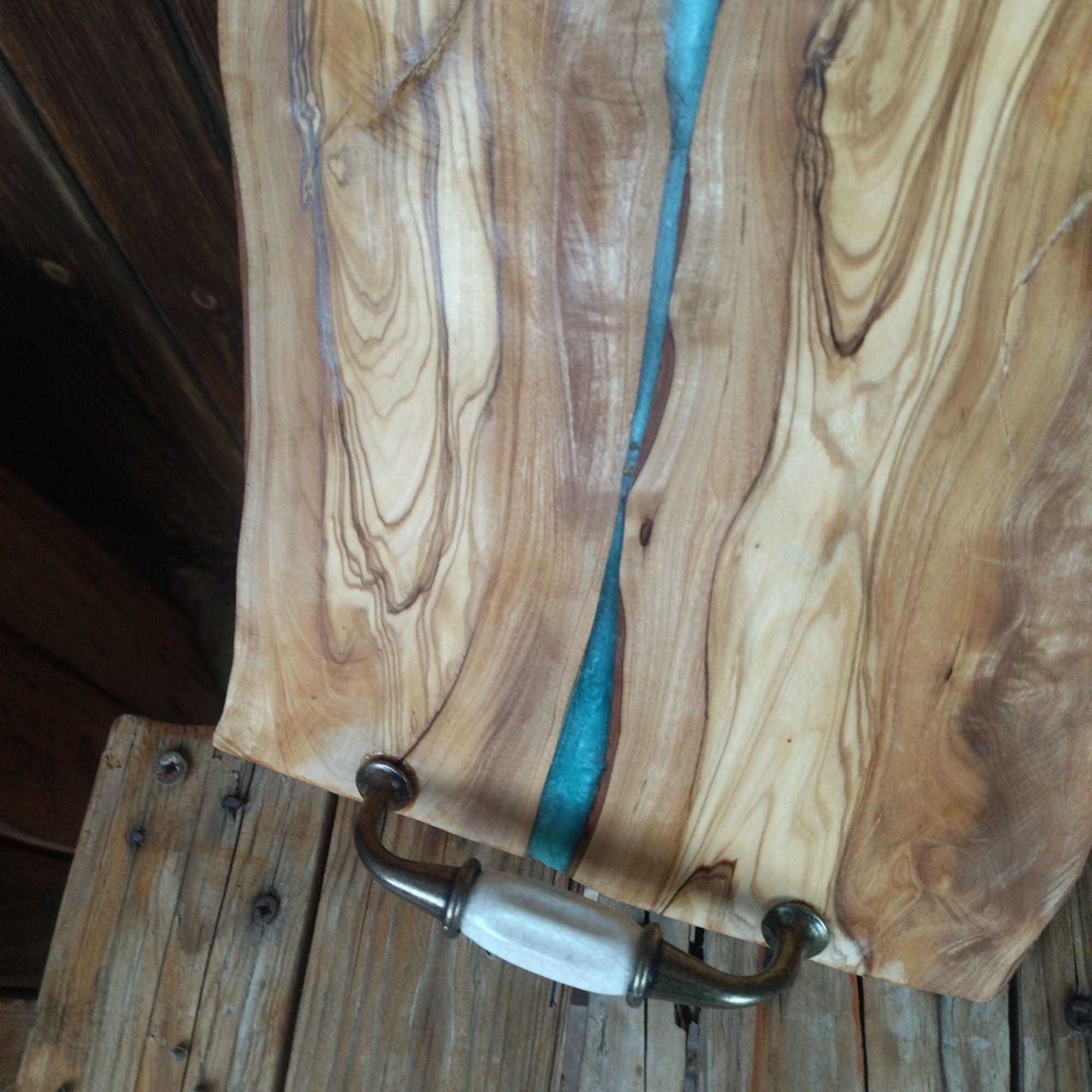 Vassoio in legno d'ulivo con resina atossica colo verde chiaro . Maniglie stile provenzale ottone e ceramica. Stupende venature di questa essenza naturali. Nessun prodotto chimico solo cera d'api. Prodotto artigianale e fatto a mano.